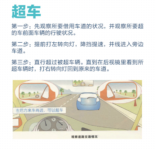 第三步:直行超过被超车辆。直到在后视镜里看到所超车辆时,打右转向灯回到原来车道。