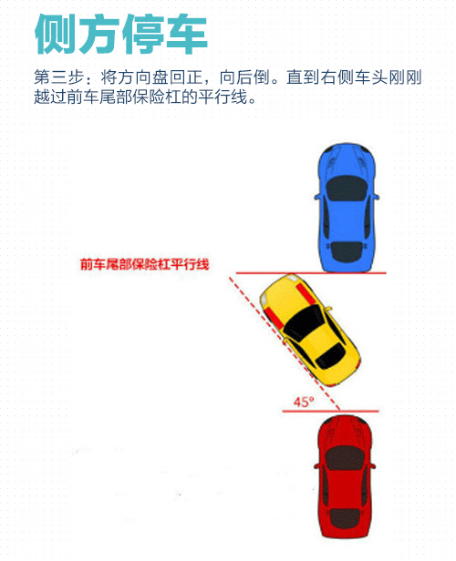 第三步:车身与路成45°角时,轻踩刹车减速,调整方向盘后前进。