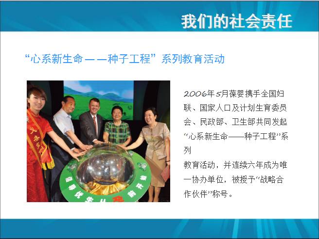 三、葆婴的社会责任 种子工程 2006年—2012年,全国妇联、国家人口及计划和生育委员会、卫生部、民政部联合推动优生优育“心系新生命—种子工程”系列教育活动,葆婴有限公司连续6年作为唯一协作单位。2010年葆婴有限公司被授予“战略合作伙伴称号”。歌手孙悦是该活动的爱心大使,同时也是葆婴的使用者,获得优购荣誉顾客称号。