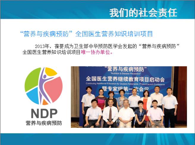 2013年,由中华预防医学会主办,针对全国600万医务人员进行的“营养与疾病预防”全国医生营养继续教育项目启动会在北京召开,葆婴有限公司是这个活动的唯一协办单位。 这个活动是为了对全国部分大中城市的医务工作者普及营养知识,使他们能够成为给百姓传递科学营养知识的骨干力量。目前,全国已经有医院开设营养科。比如,北京301医院,湘雅三医院,上海很多三甲医院等。 真正健康基金——”天使之心”儿童先心病救助项目