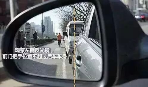 下车前,我们还需要再观察左侧反光镜,尽量让前车门把手的位置,不超过后车的车身。当然,如果后面没有车进行参考的话,可以看下车身边缘与停车线之间的距离。主要是为确定自己停车的位置,车身不影响其他交通参与者的通过,避免被其他车辆划伤等。