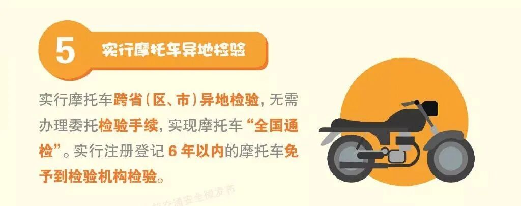 第五项是针对摩友的一项利好。不仅仅实现了摩托车新车六年免检,更是可以摩托车异地验车。对于很多异地实用摩托车的朋友省去了很多精力。