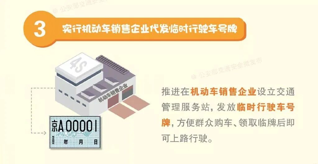 小乐觉得这个第三条有必要单独说一说,毕竟对于买车的朋友来说正将是一项前无古人的福利!今后在购买车辆提车时可以通过汽车经销商也就是4S店直接办理临时号牌,无需再到车管所排队办理了。大大简化了车主购买新车时耗费的精力。这一项政策目前已经在北京多家汽车经销商试点。6月1日将在全国正式实施。