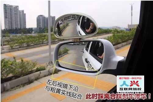 4、继续离合半联动控制车速,慢速靠近停车点,当左后视镜下沿与第二条粗黄线齐平时,先踩脚刹,后踩离合,将车停稳,关右转向灯。还有一种确定停车位置的方法,那就是看右边雨刮器上的凸起点,与停车标志牌的杆,还有眼睛成三点一线时,就可以踩离合踩刹车停车了。将车停稳之后,等待语音提示。(车内语音提示:定点准确)