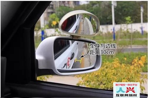 3、观察引擎盖右侧1/3的点,当与路边线重合时,就是车身与路边距离30cm左右。
