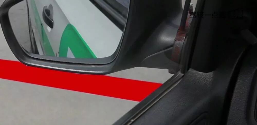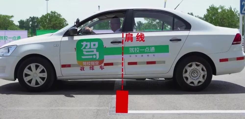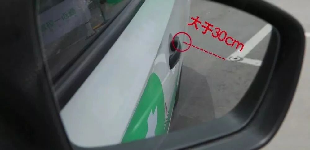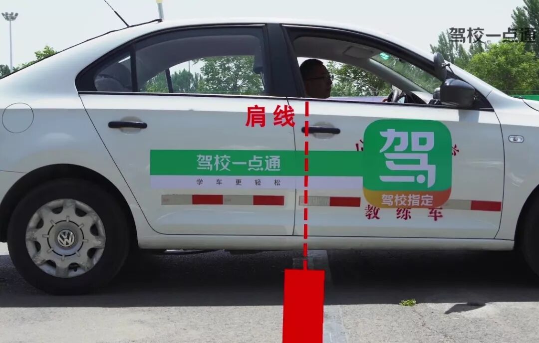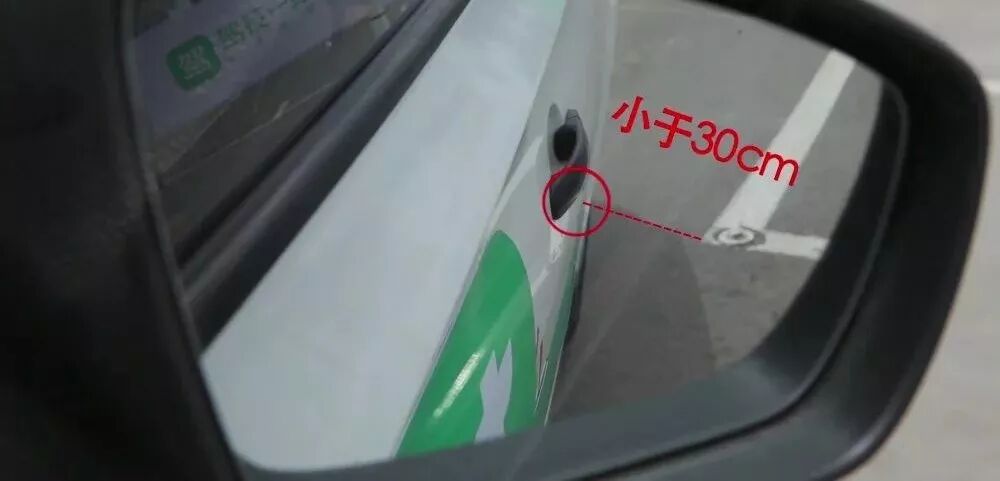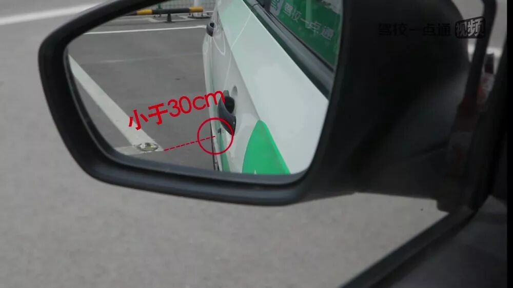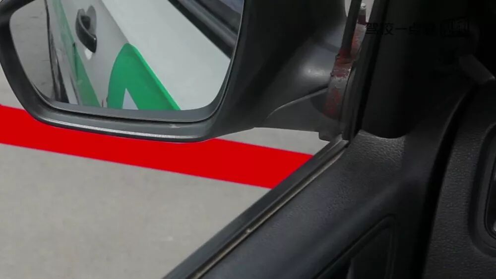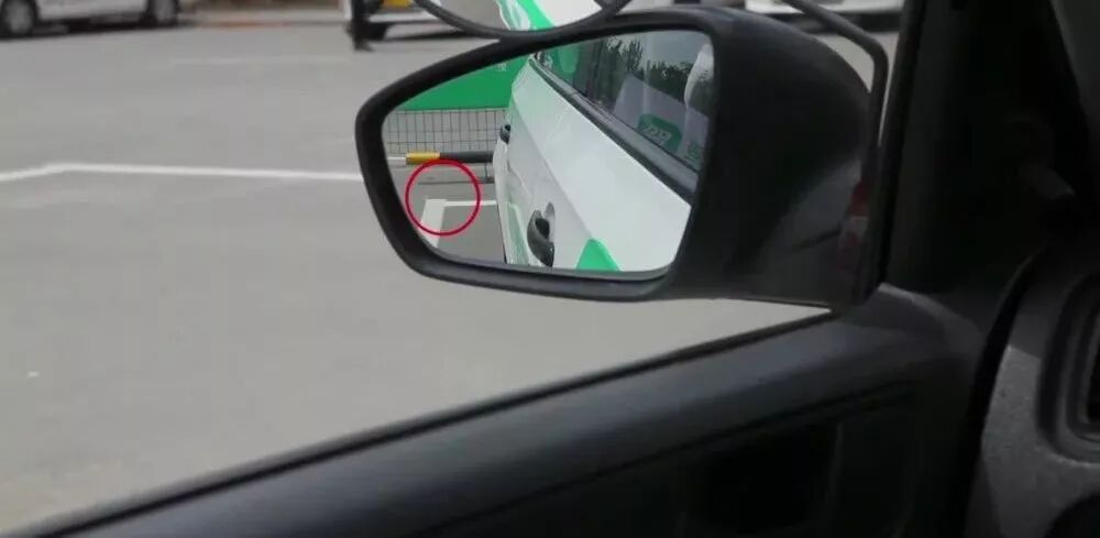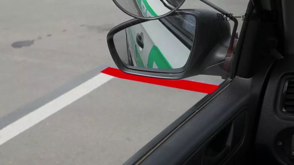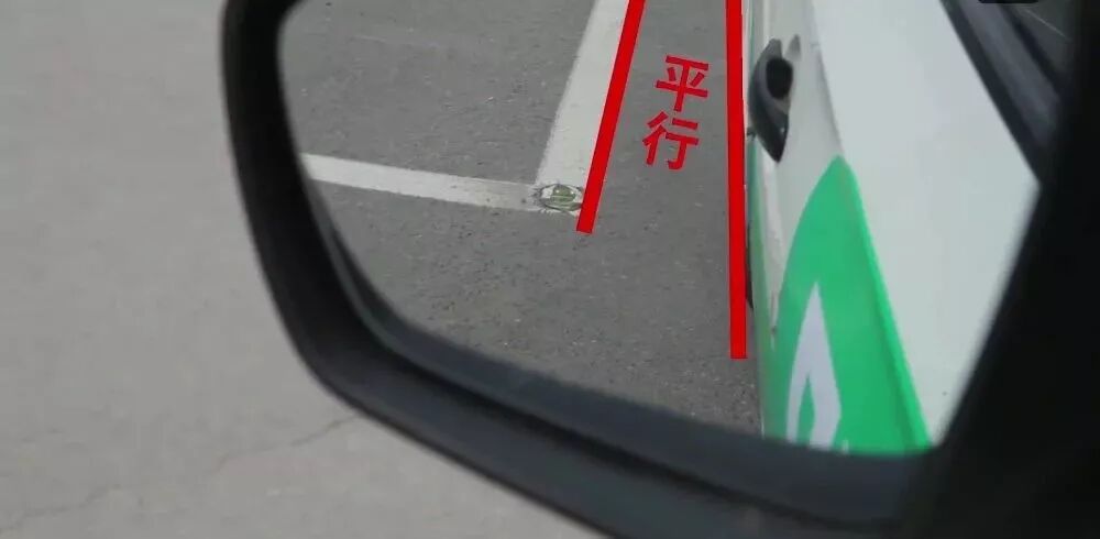 当左后视镜下沿与控制线重合时,方向盘迅速向右打满