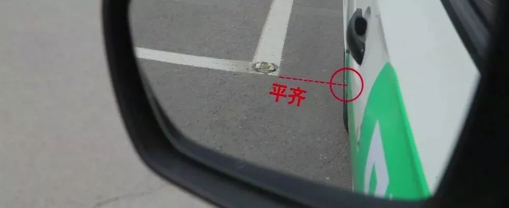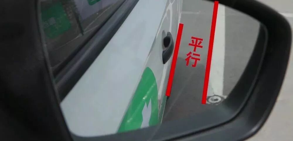 观察左后视镜,当左后视镜下沿遮住库区左前方横线时,停车