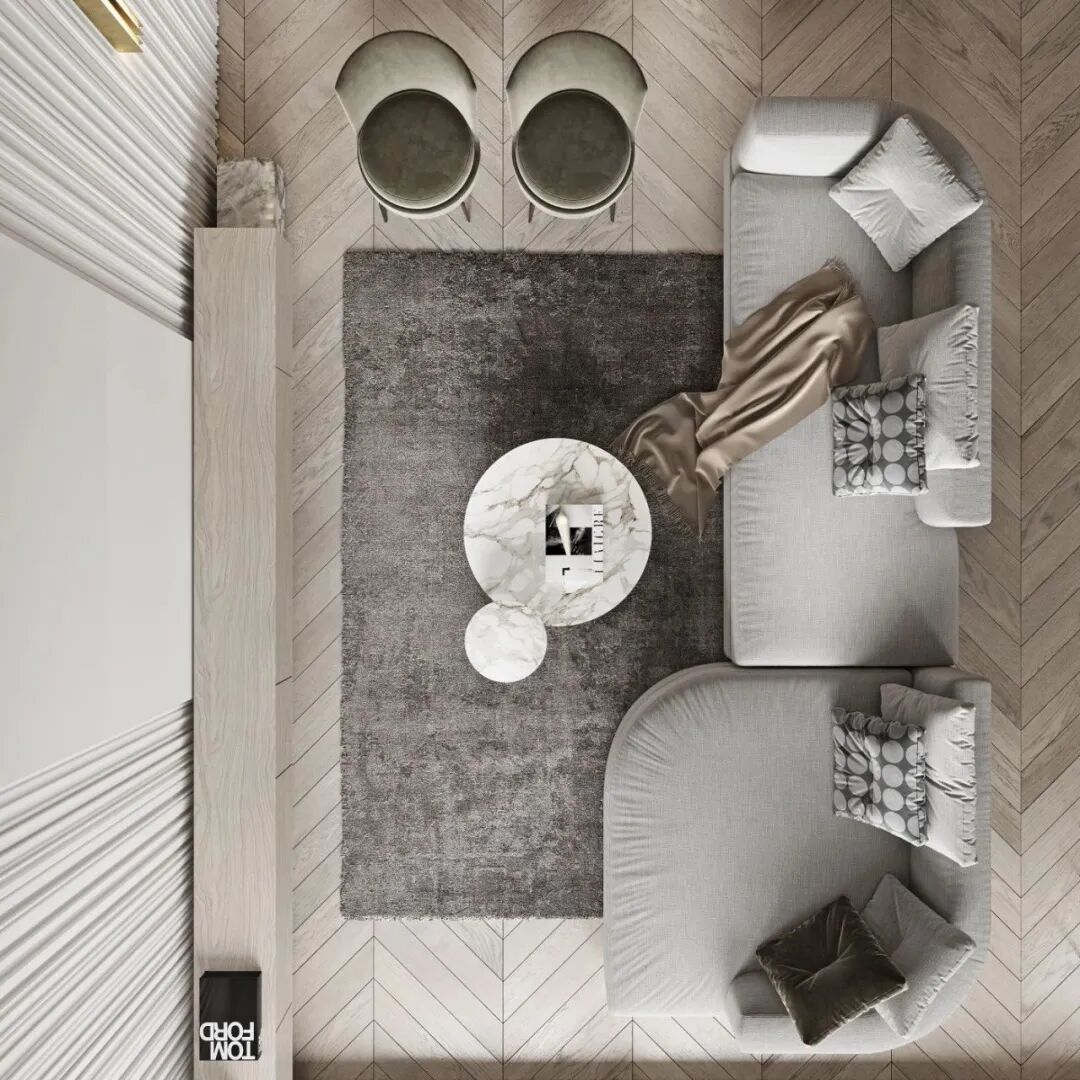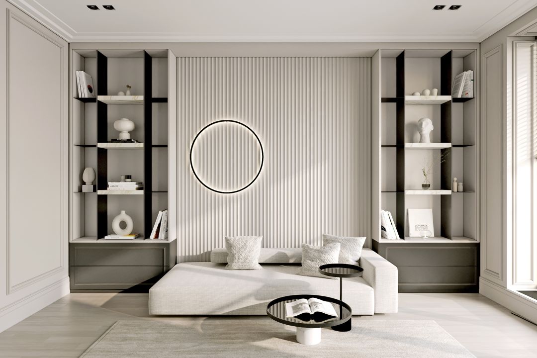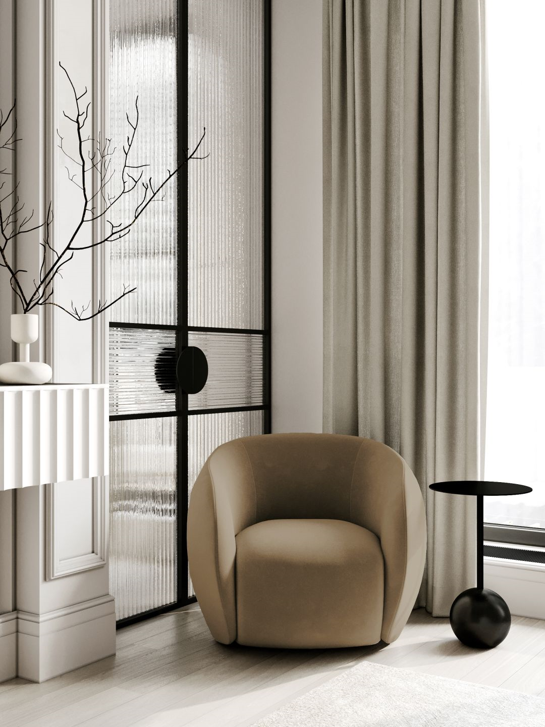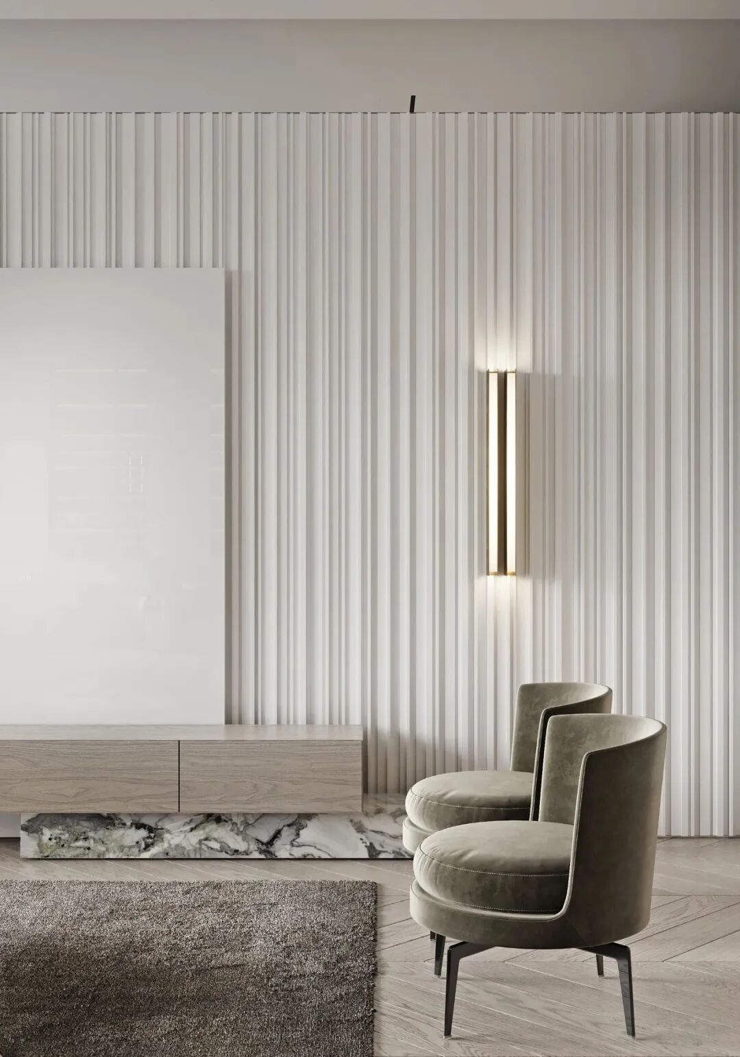 起居空间,白色线板墙极具律动感,搭配金属、大理石、绒布、原木等多种材质,空间形象瞬间丰富起来。