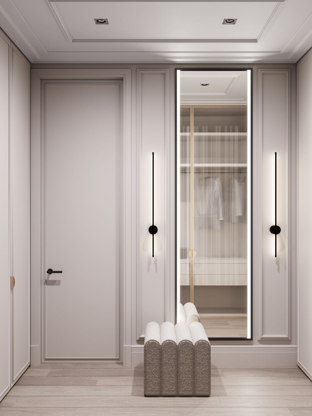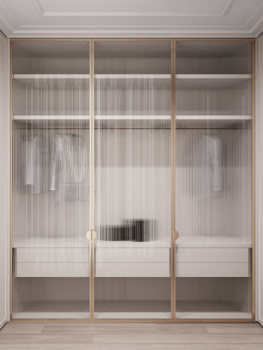 。对称结构的衣柜饰面设计了简单的线条装饰,