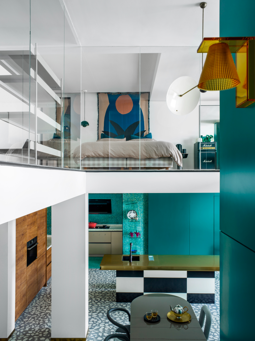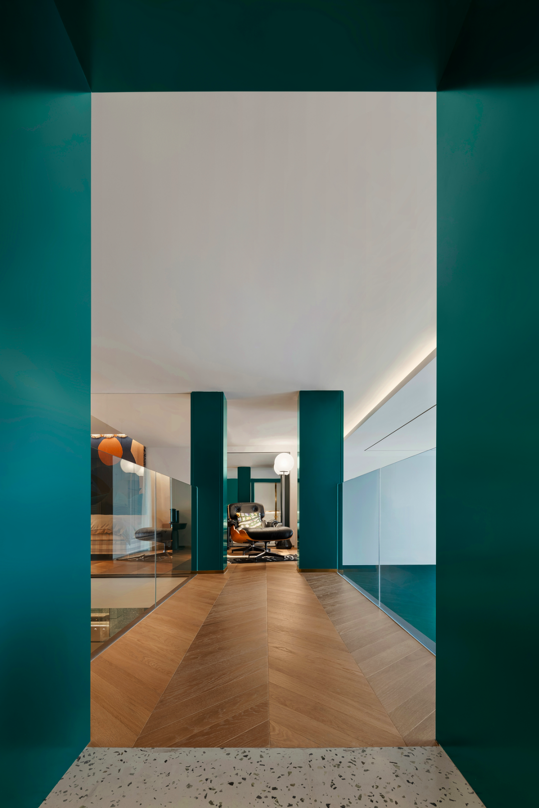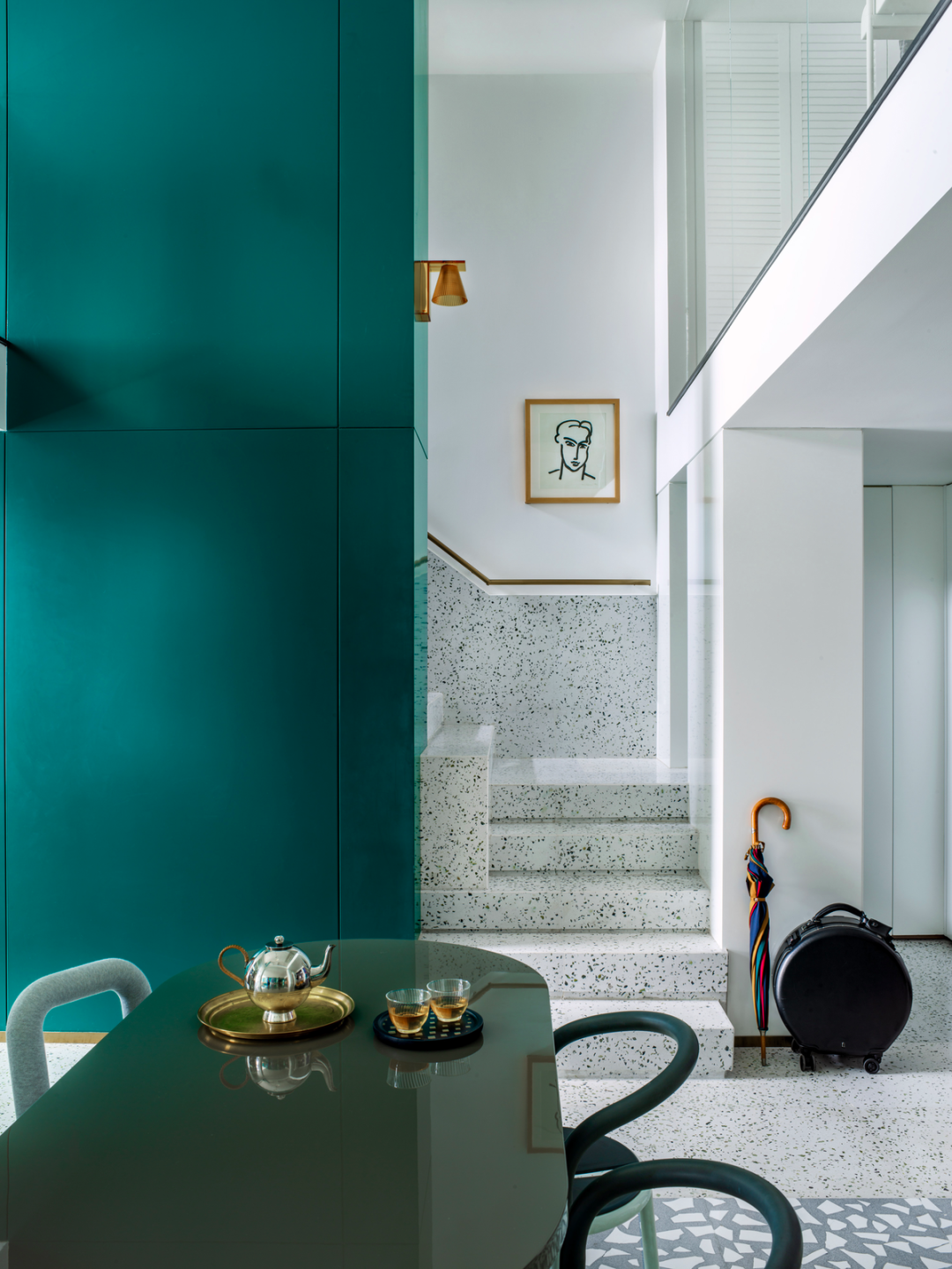 浓绿色和黄铜线牵引你步入二楼耿波私人的玻璃盒,一道可以纵观餐厨和客厅的连廊给予慢慢转换身份的时间。
