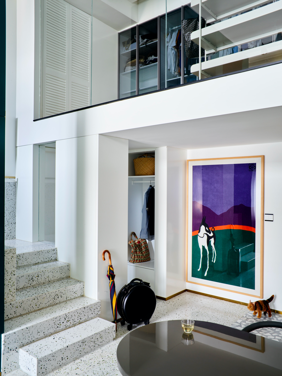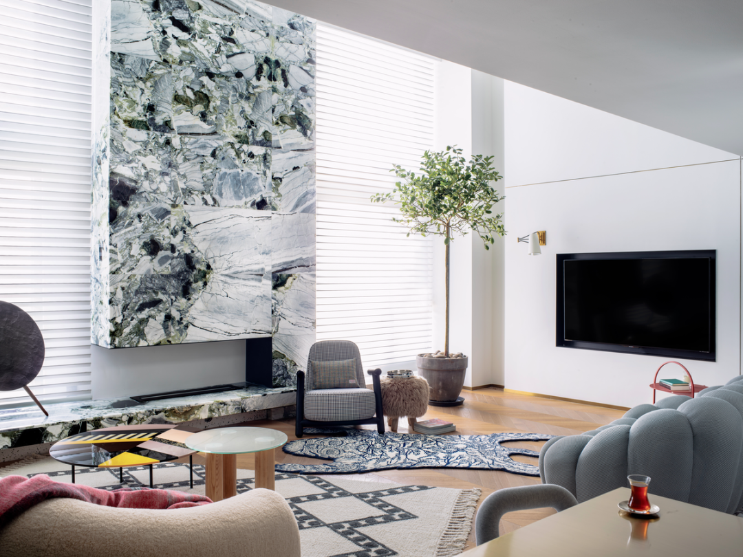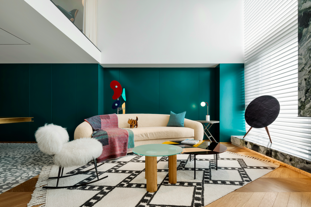 Foscarini 的 ORBITAL 落地灯与 Moroso 的茶几继续讲述着耿波的摩登波普审美趣味,大理石铺就的壁炉延伸视觉,挑逗起你对二楼的好奇。