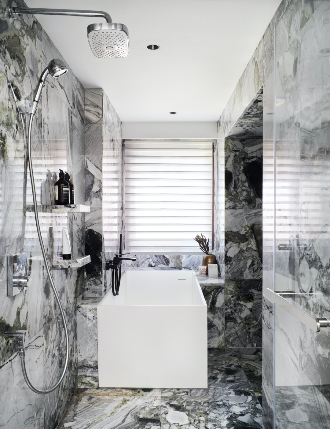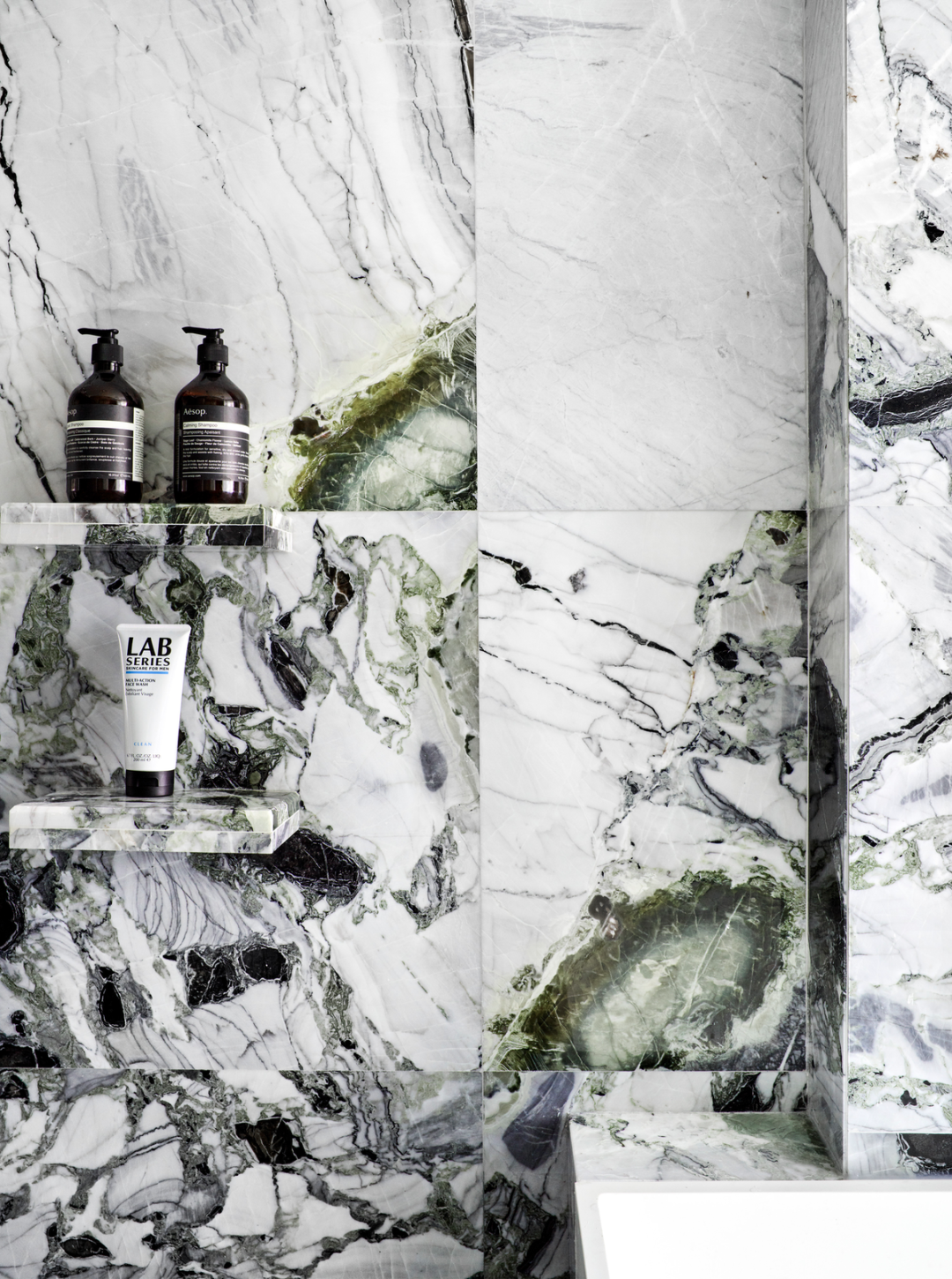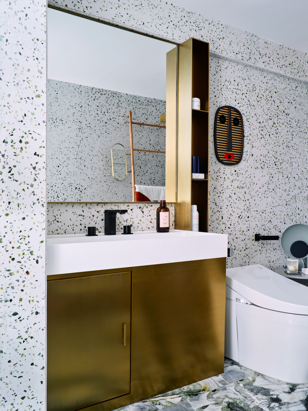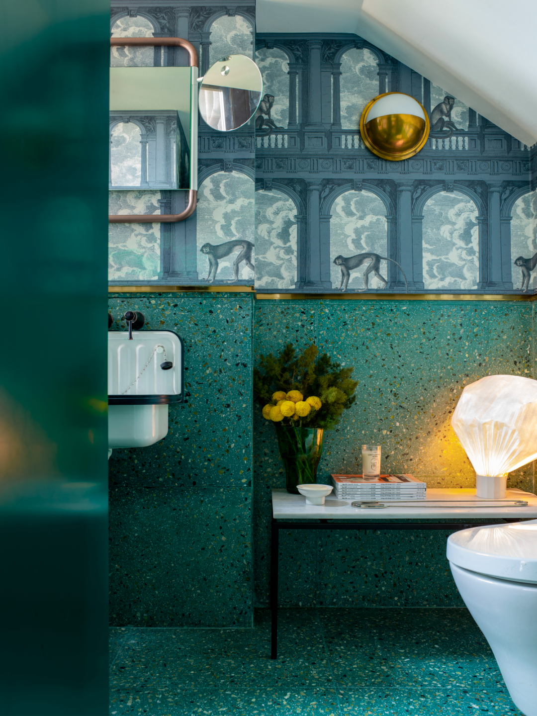 楼梯下方的鸡肋斜面空间被很好地利用做客卫,Cole&So 的壁纸也让这个特殊的角落多了一丝神秘感。