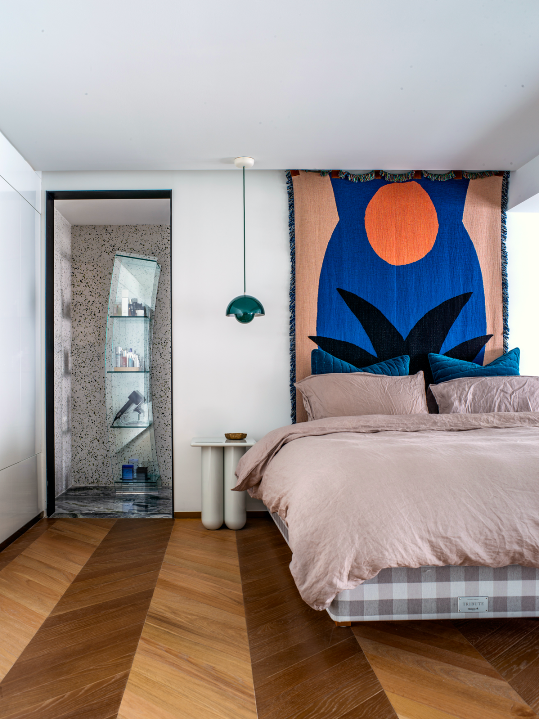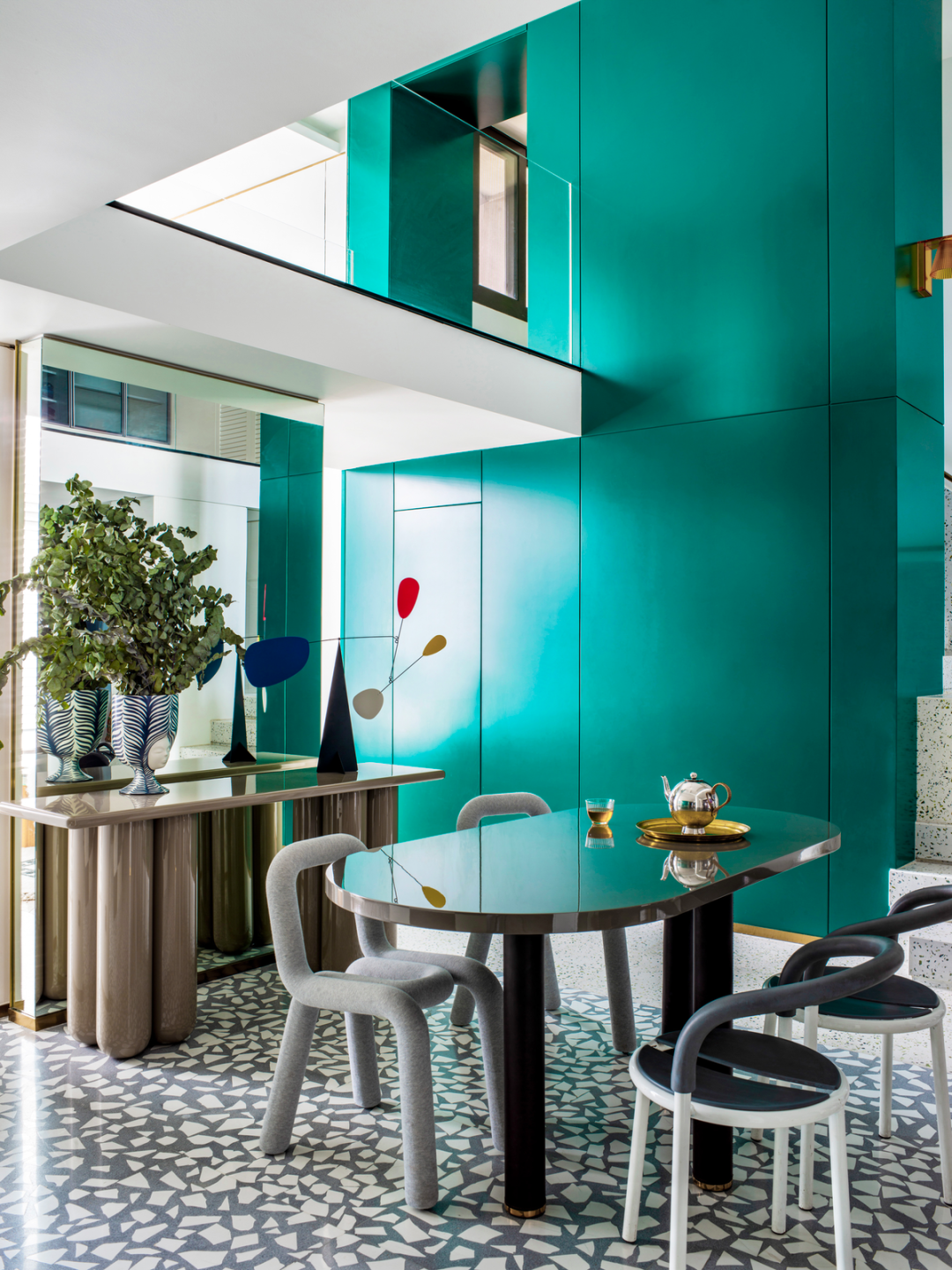 大块面灰白水磨石地板区隔出迎面而来的餐厨区域,来自 MOUSTACH 的 Bold Chair 带动灵动线条的同时,也增加了这片中心区域的柔软。