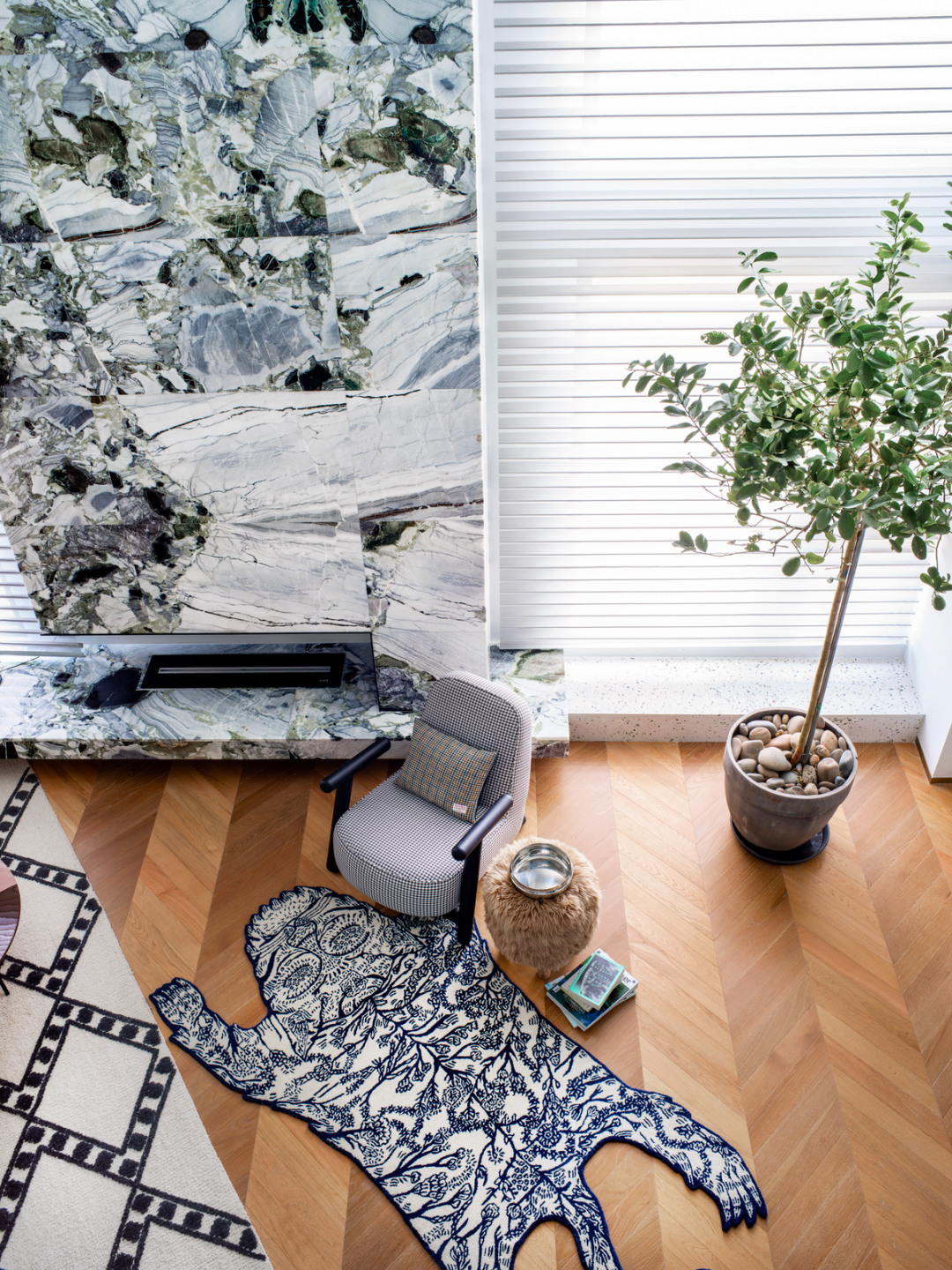 同时, FRANK CHOU DESIGN STUDIO 和 HC28 合作的千鸟格单椅与吧台进行细节上的呼应,MOUSTACH 的老虎地毯同样相得益彰。