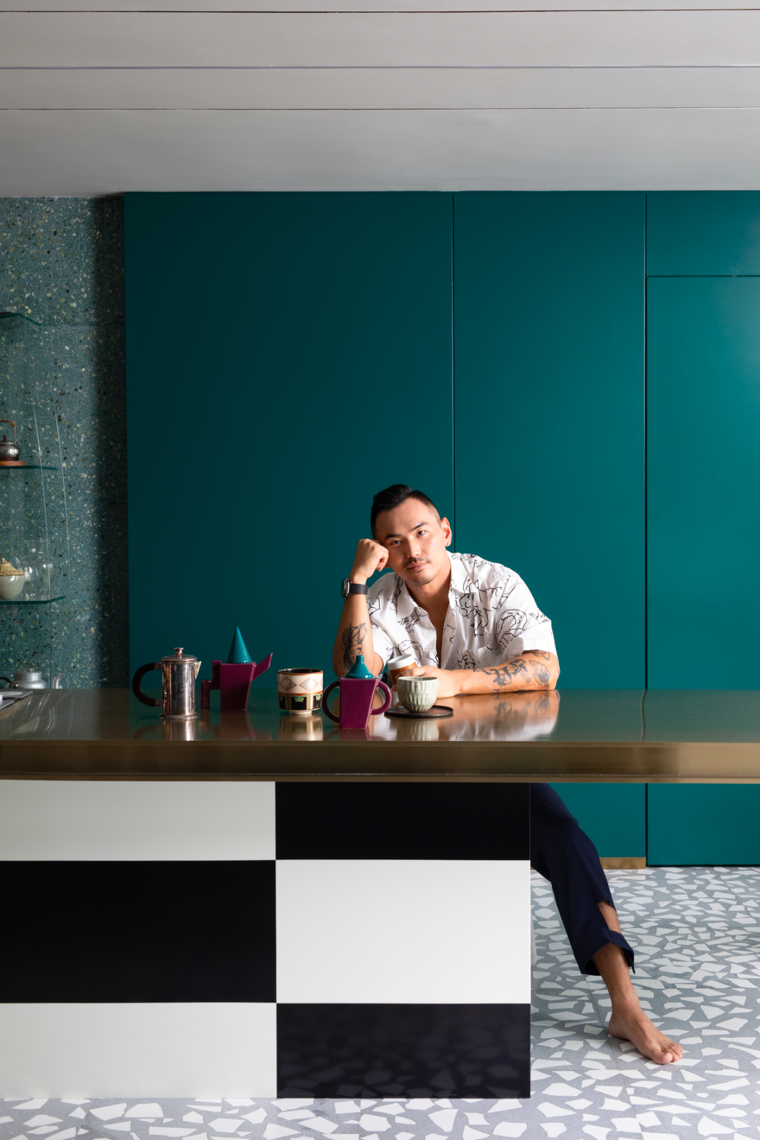 吧台的棋盘底座正是他体验了东京的 Hyatt Centric 后,因为爱上他们的黑白格家具而重新设计打造。