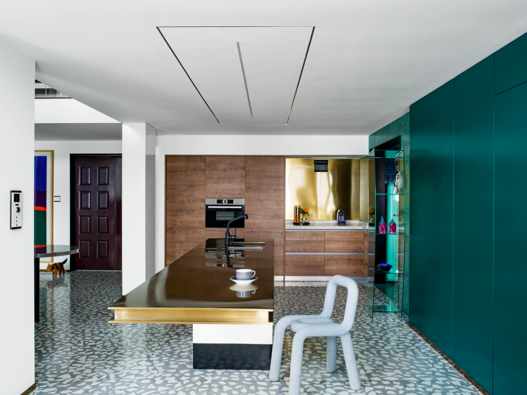 设计师善舞材质和色彩,大面积介于孔雀蓝和翡翠绿之间的浓绿色串联起厨房和会客空间,又通过在细微的水磨石纹理和烤漆质感上稍作区别,搭配黄铜装饰线,让空间的皮和骨都稍显硬朗。