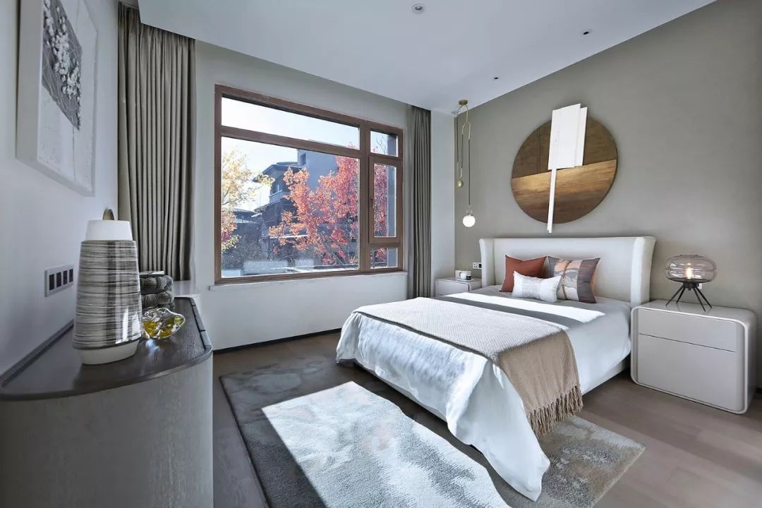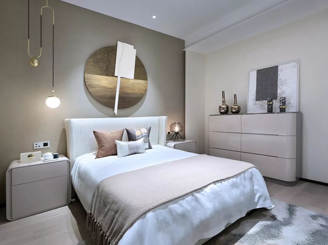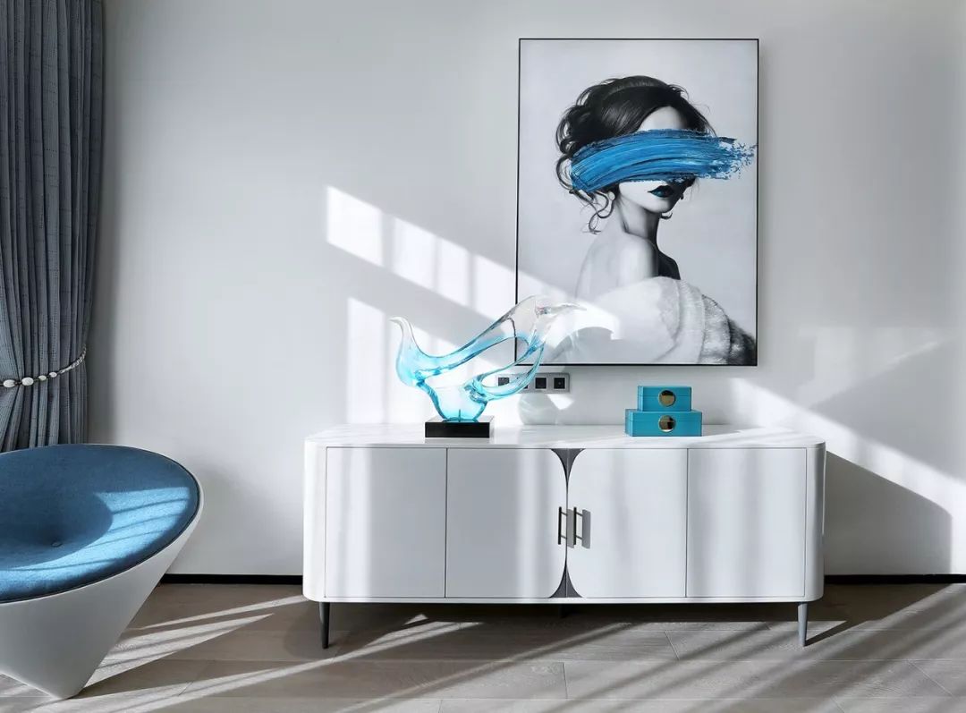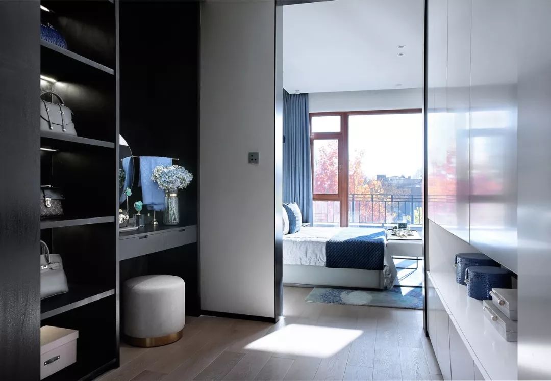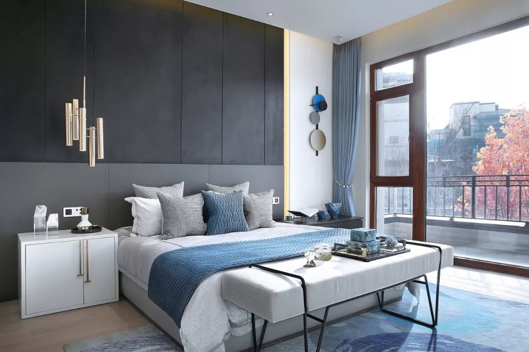 主卧主背景以白灰黑构成,极简中透着贵气,不同性格的材质产生不同的感情力量,蓝色串联起的点缀又让空间添了一份静谧清雅。
