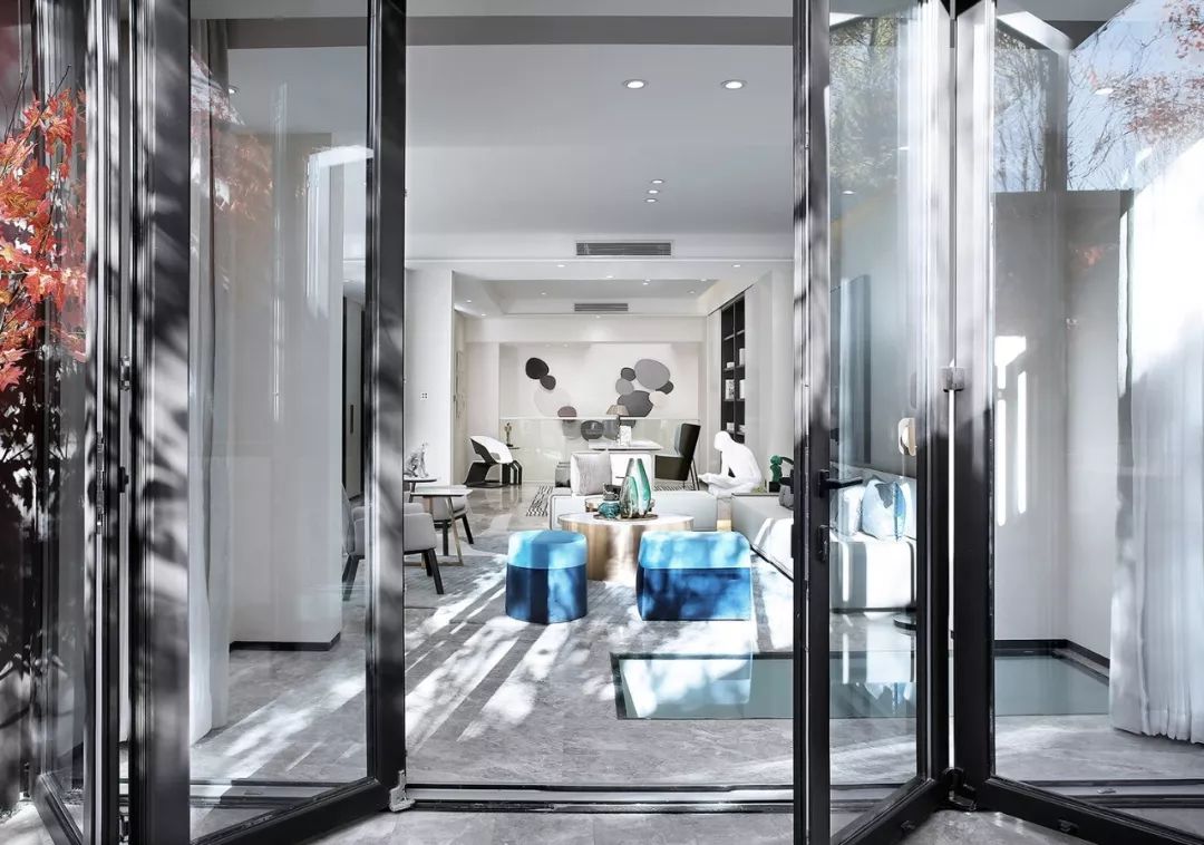 大开大合的空间,将生活细碎化零为整,以极简的形式将其进行清晰的界定。负一层与院落互通,将客厅沿窗面外扩做全开敞落地折叠门,并由此使负二层采光天井纳如室内,又与地面齐平,无拦断遮挡,使整个休闲会客区充分享受到室内外人与自然之间的互动。