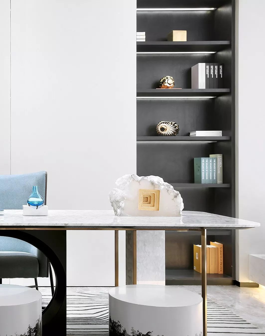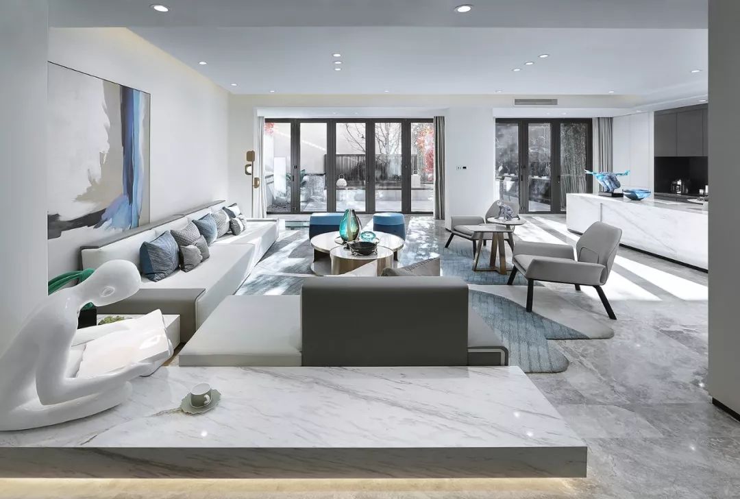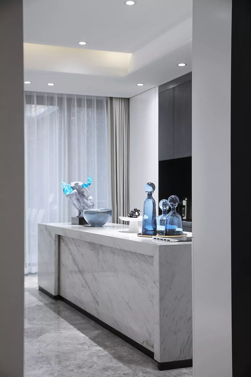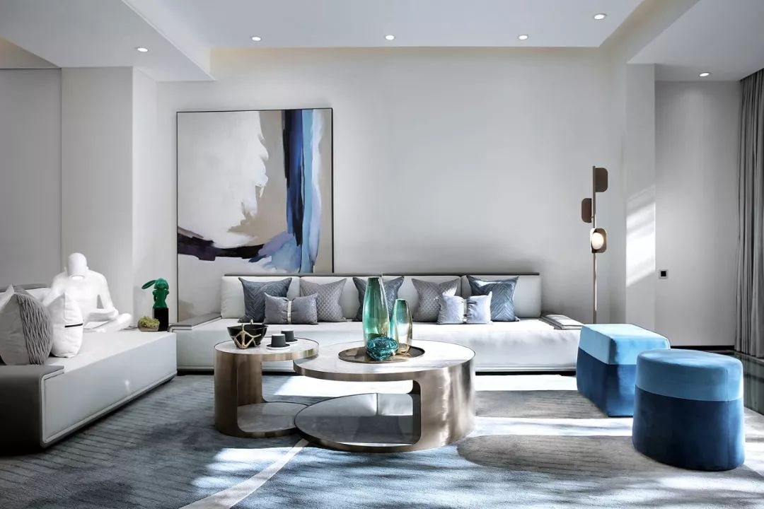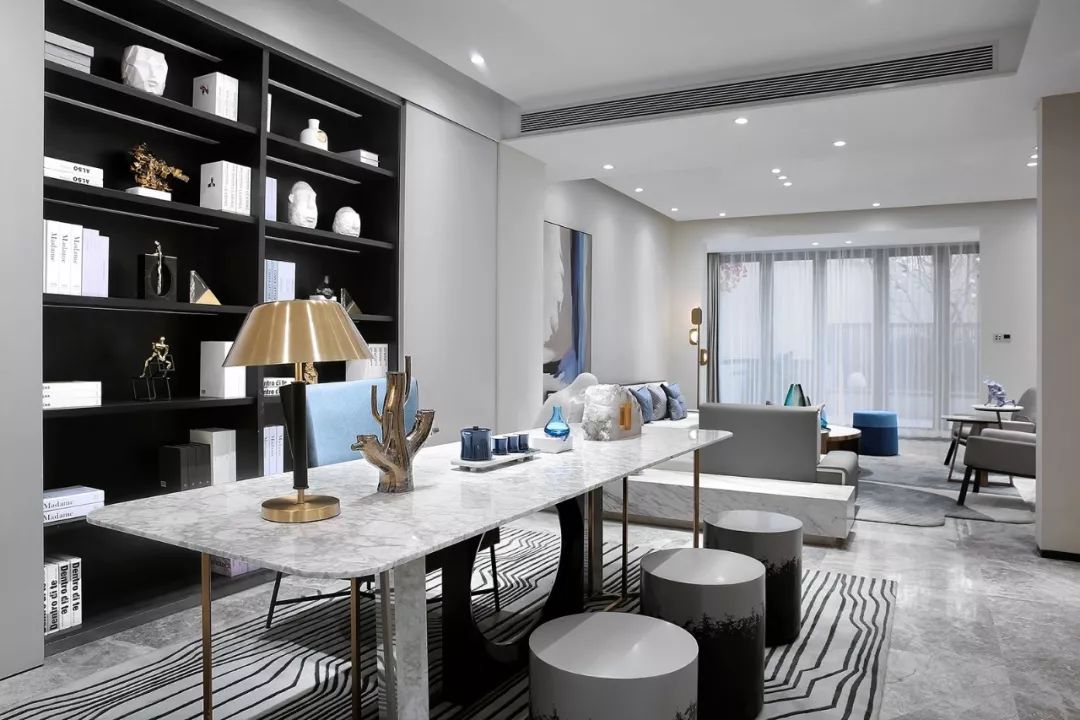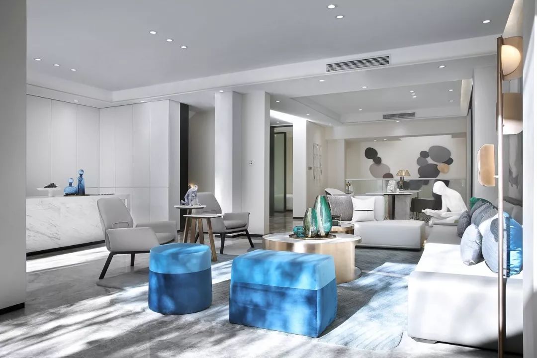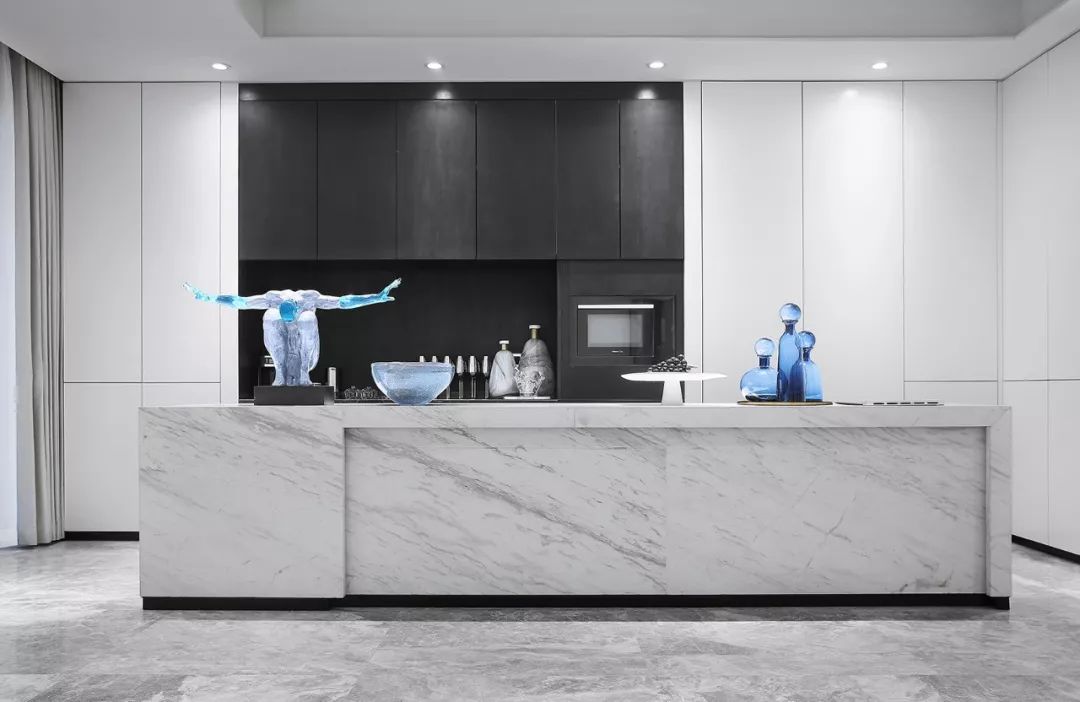 墙面以白黑为主基色,一抹清蓝点亮整个空间,意将人的视觉感受归纯。金属质感与琉璃光影在白色石材的映衬下显得灵动而清丽。