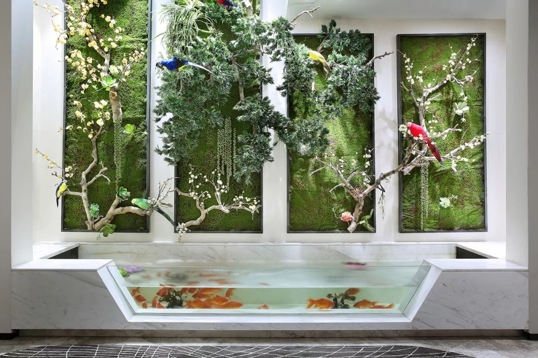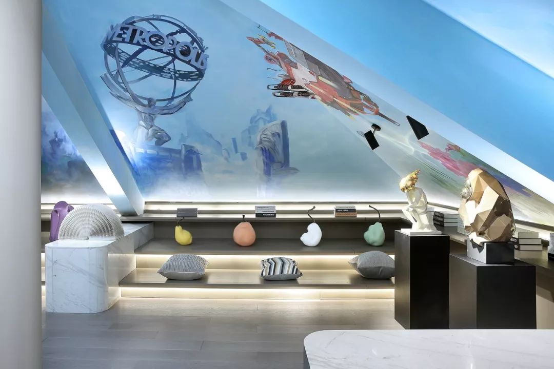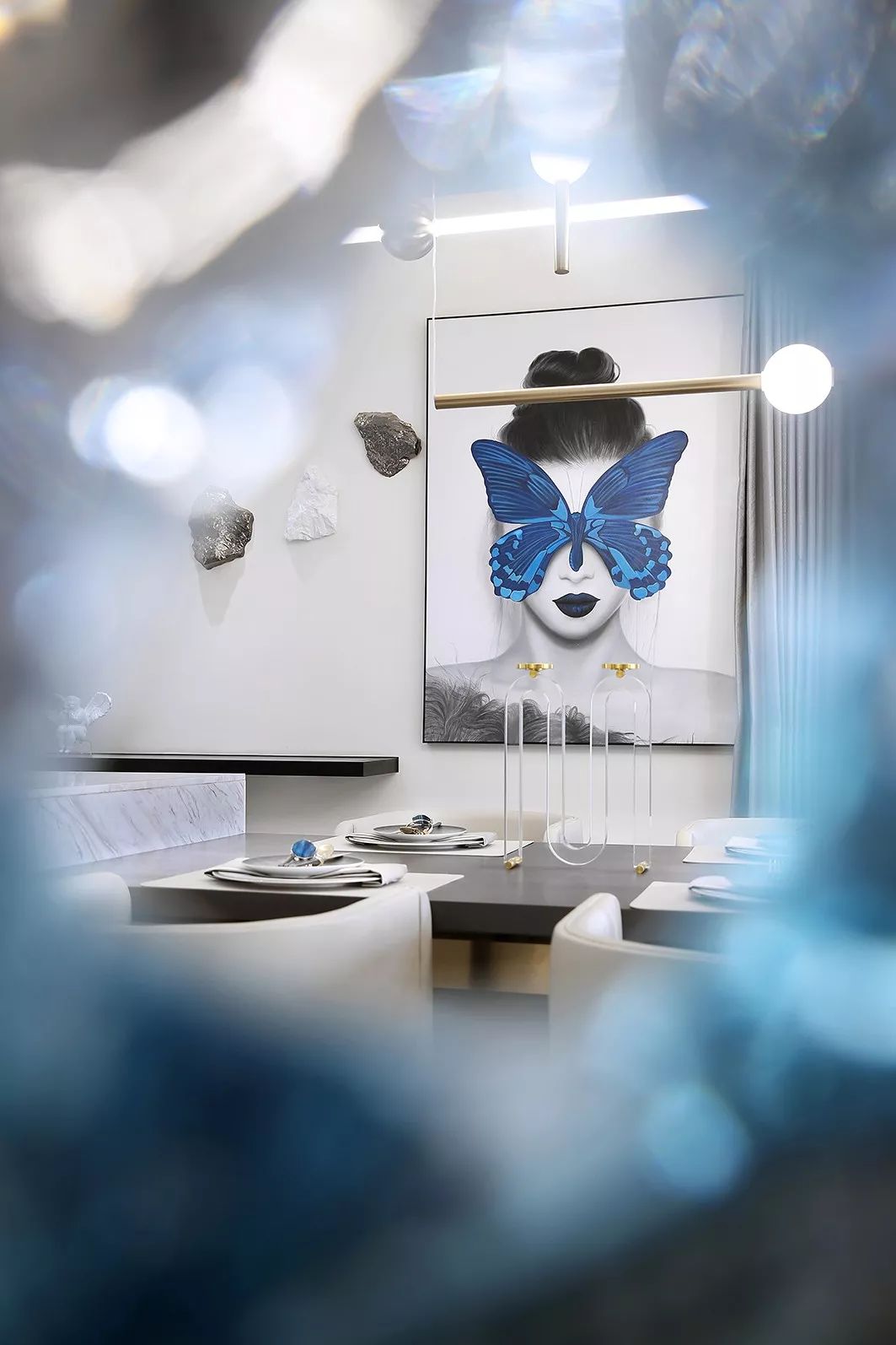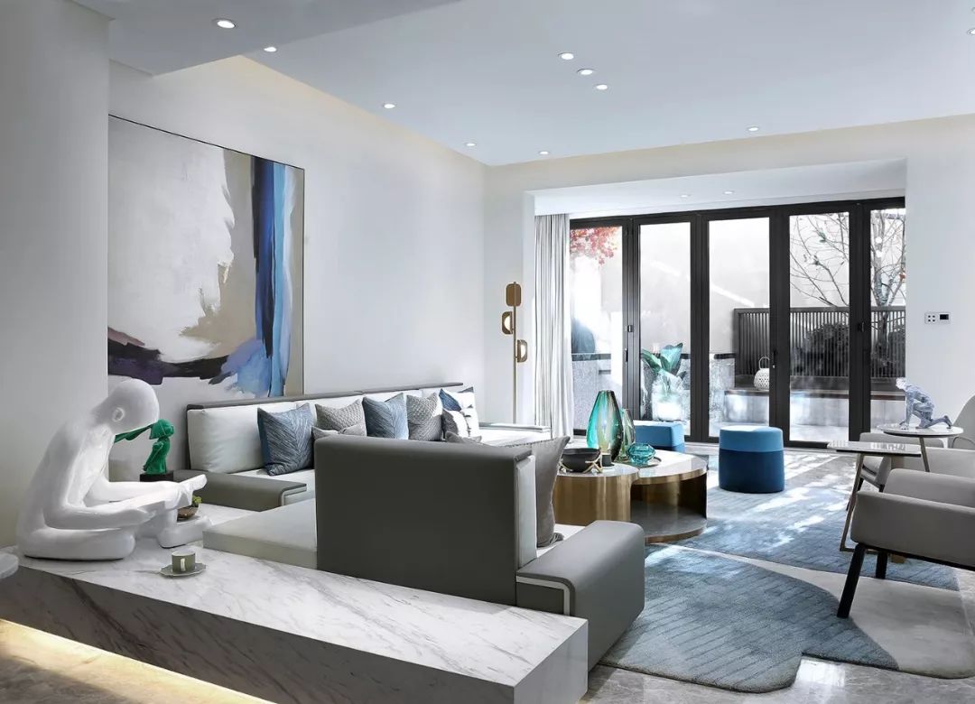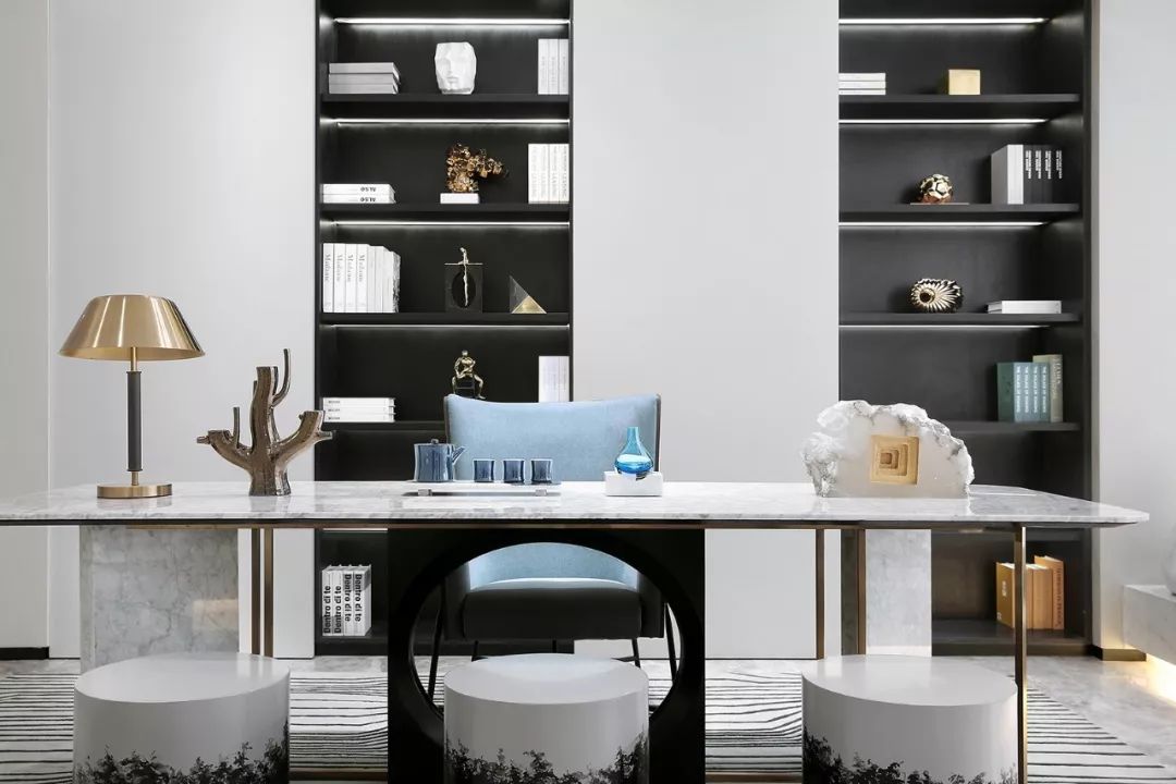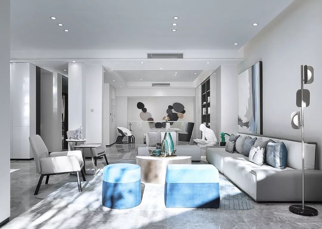墙面以白黑为主基色,一抹清蓝点亮整个空间,意将人的视觉感受归纯。金属质感与琉璃光影在白色石材的映衬下显得灵动而清丽。