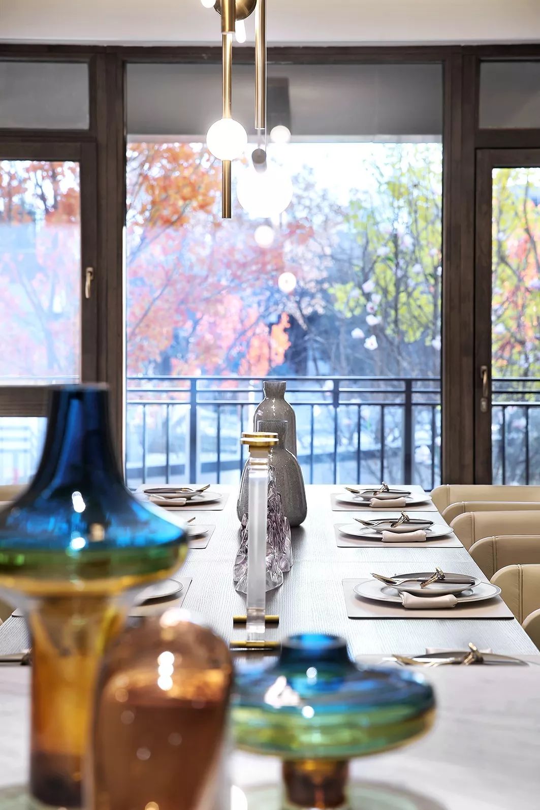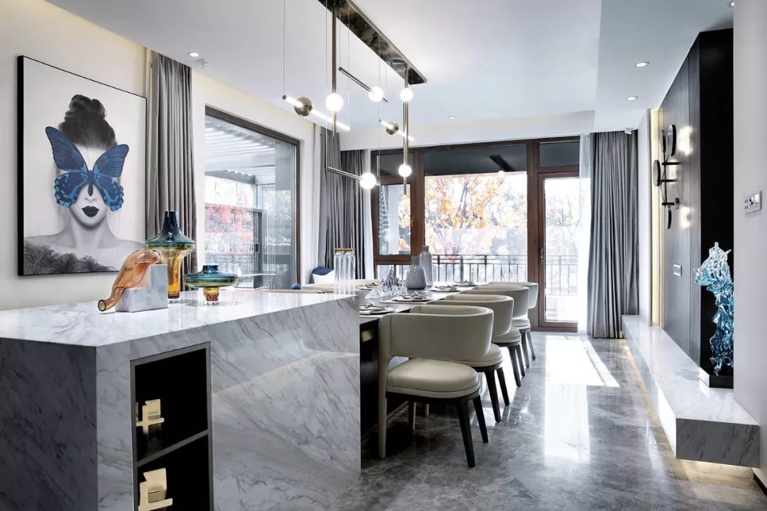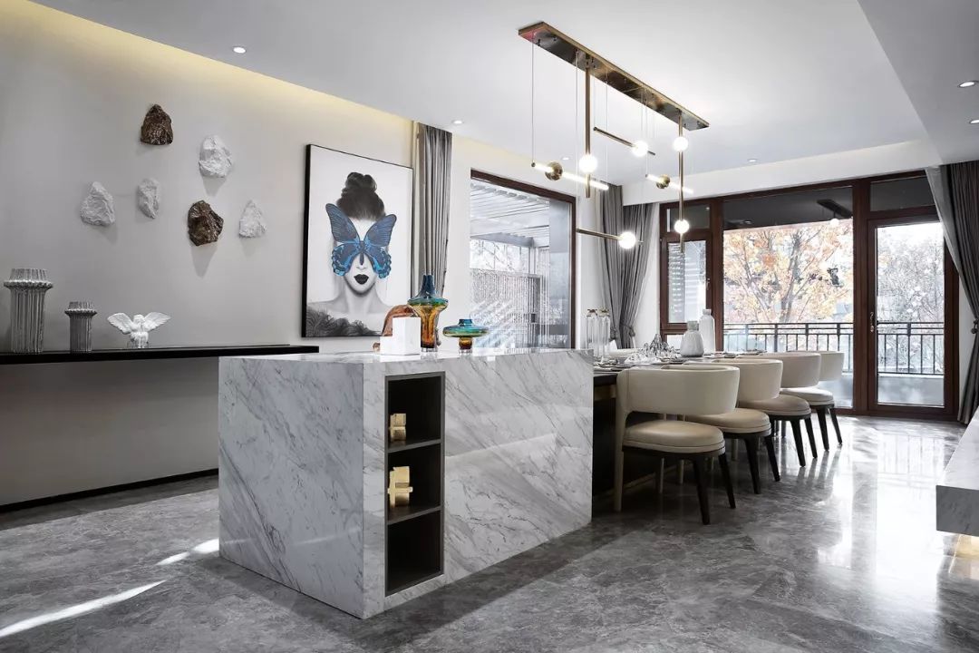 岛台与餐桌连为一体,形成超长就餐区,简雅与轻奢让明媚的早餐延续至浪漫的晚餐。