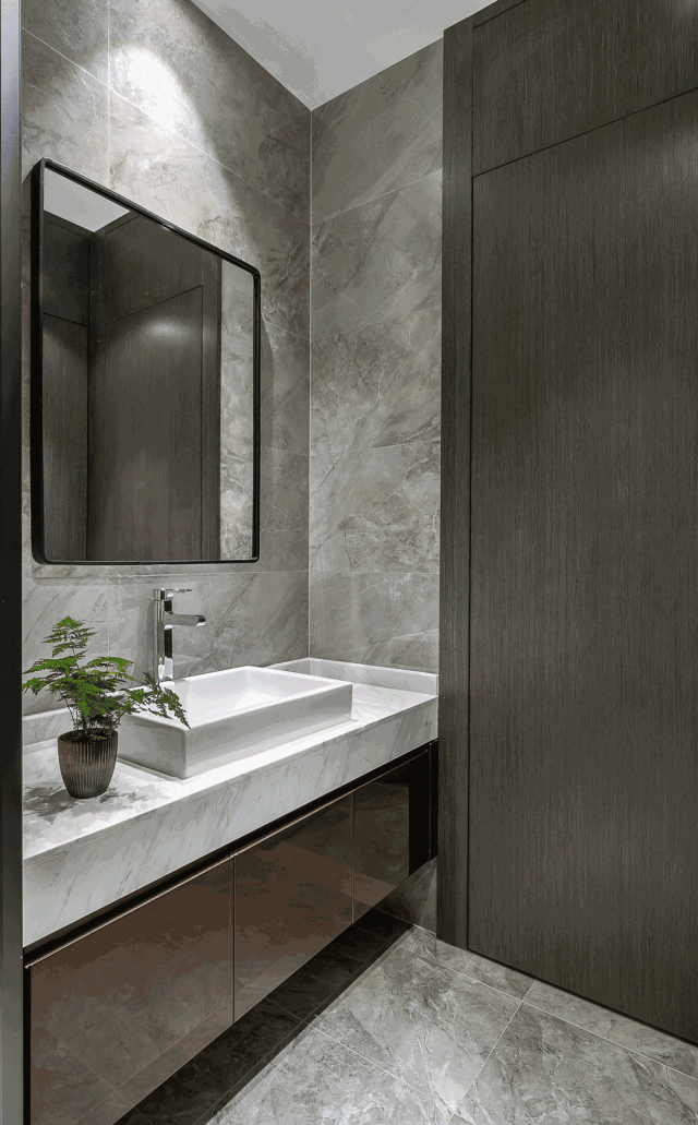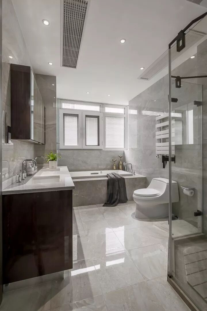 卫生间全部选用了灰色石材纹理的瓷砖打造,极其简单的线条,极其纯粹的色彩,使得空间充满现代感。充满自然的烟灰色纹理,具有一种大自然的张力和感召力,不仅让空间拥有功能体验,更是一种与大自然色彩的对话,是一种美的享受。给人一种闲适的意趣,一尘不染、素净澄明。