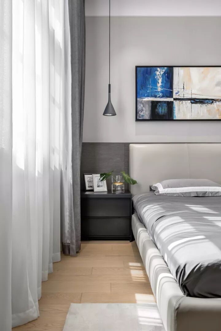 蓝白相间装饰画,也为空间增加了色彩的节奏感,让空间更富意趣。线性垂下的床头吊灯, 半亚光素色真皮在深色木饰面的衬托下呈现丰富的层次感,在光线的映衬下呈现出一个充满温馨与质感的空间。