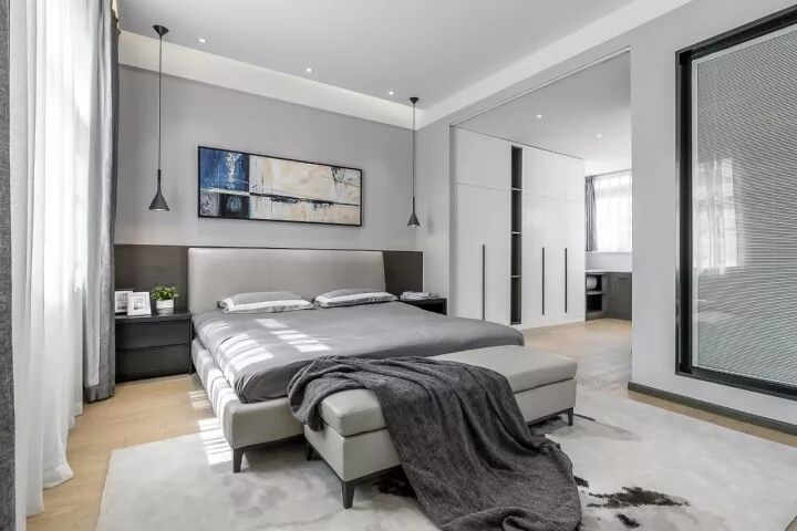 主卧延续了客、餐厅的理性调性,和开敞式的设计手法。设计师选用了更为暖意的实木地板,打破了家具的沉闷感,使空间更加通透,并且呈现出冷暖、深浅不一的视觉效果。