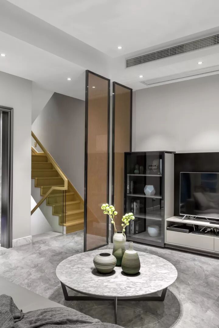 该项目总共分为5层,一层负一层为主要功能区。其中一层为客厅、餐厅、厨房;负一层为视听室、酒吧区、美妆工作室及车库。二楼为小孩房、客房、长辈房。三楼为主卧的套房。四楼为衣帽间与储藏间。一层客厅、餐厅、楼梯间采用全开放式设计。简单的线条或玻璃对空间分隔。使动线若影若现。尽可能诠释空间,干净利索、自然安稳。