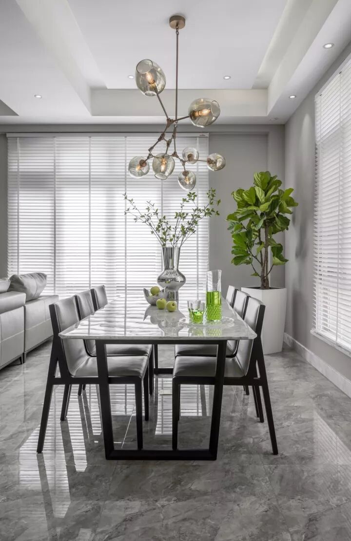 设计师利用简洁的线条和强烈的色调对比,配合不落俗套的家具,把酷气和帅气全面呈现,给人耳目一新的感觉。餐桌上选用银质的饰品和果盘,配合精致的水晶饰品,也使得空间愈发沉稳内敛、精致优雅。淡淡的黄绿色的点缀,使空间个性鲜明、视觉效果强烈。