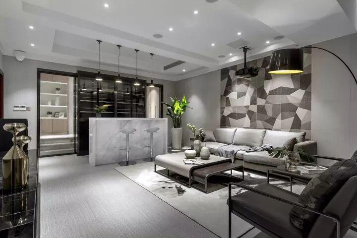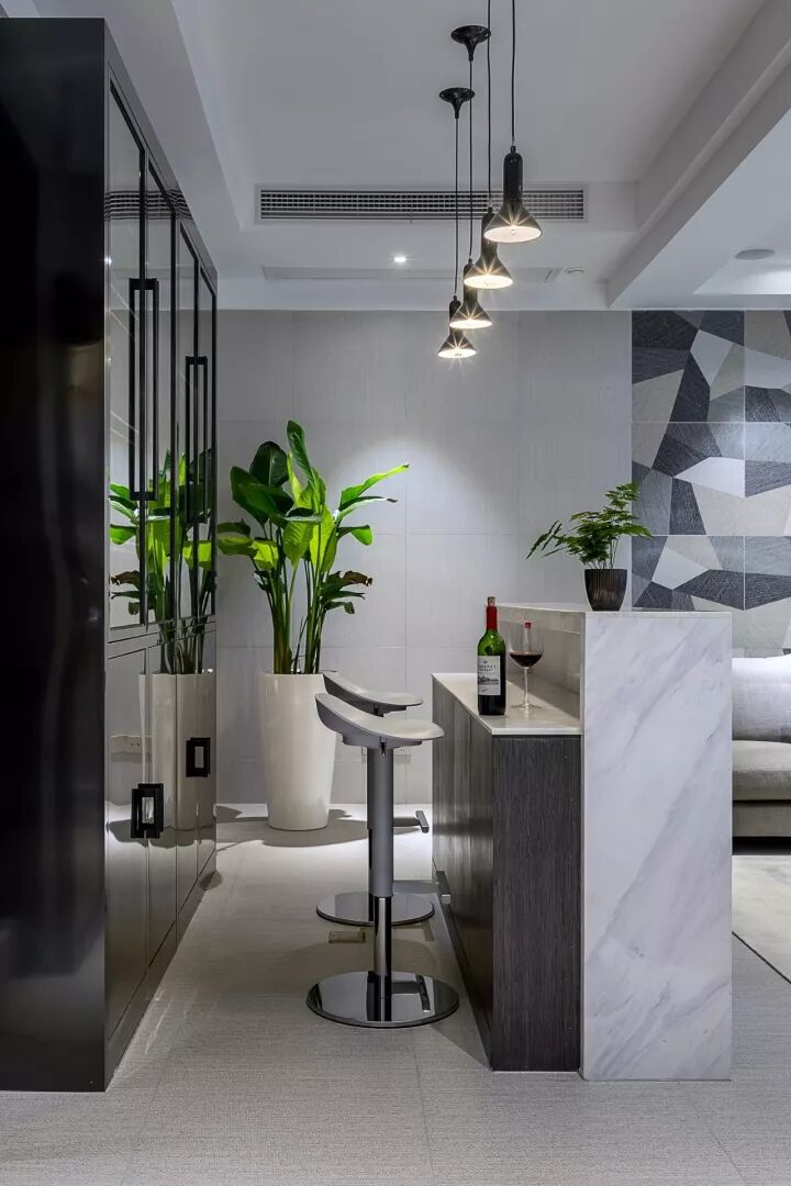 爵士白大理石的酒吧台,几何形灰色布纹肌理质感的瓷砖,时尚冷峻不失温暖。粗质棉麻的沙发搭配深咖真皮单椅,低调深沉带着原有的偏旁。