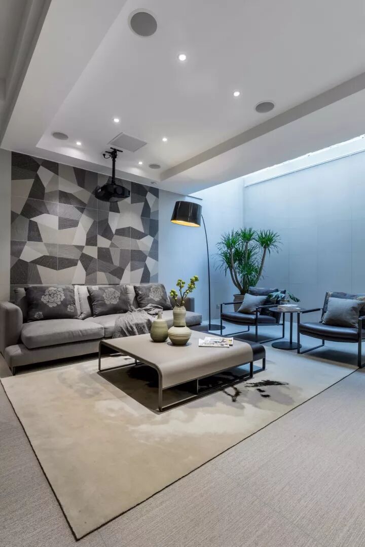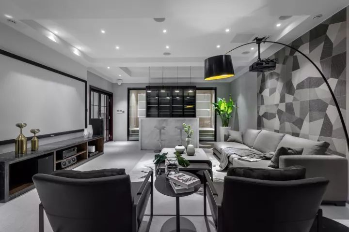 如同黑白电影的场景,将格局简化成黑白色块,几何形的装饰背景呈现不一样的韵律,给空间增添了戏剧性的效果。也让黑白灰的节奏得到了多样性的演变。设计师用黑白灰呈现一个耐看、极具现代感的视听空间。