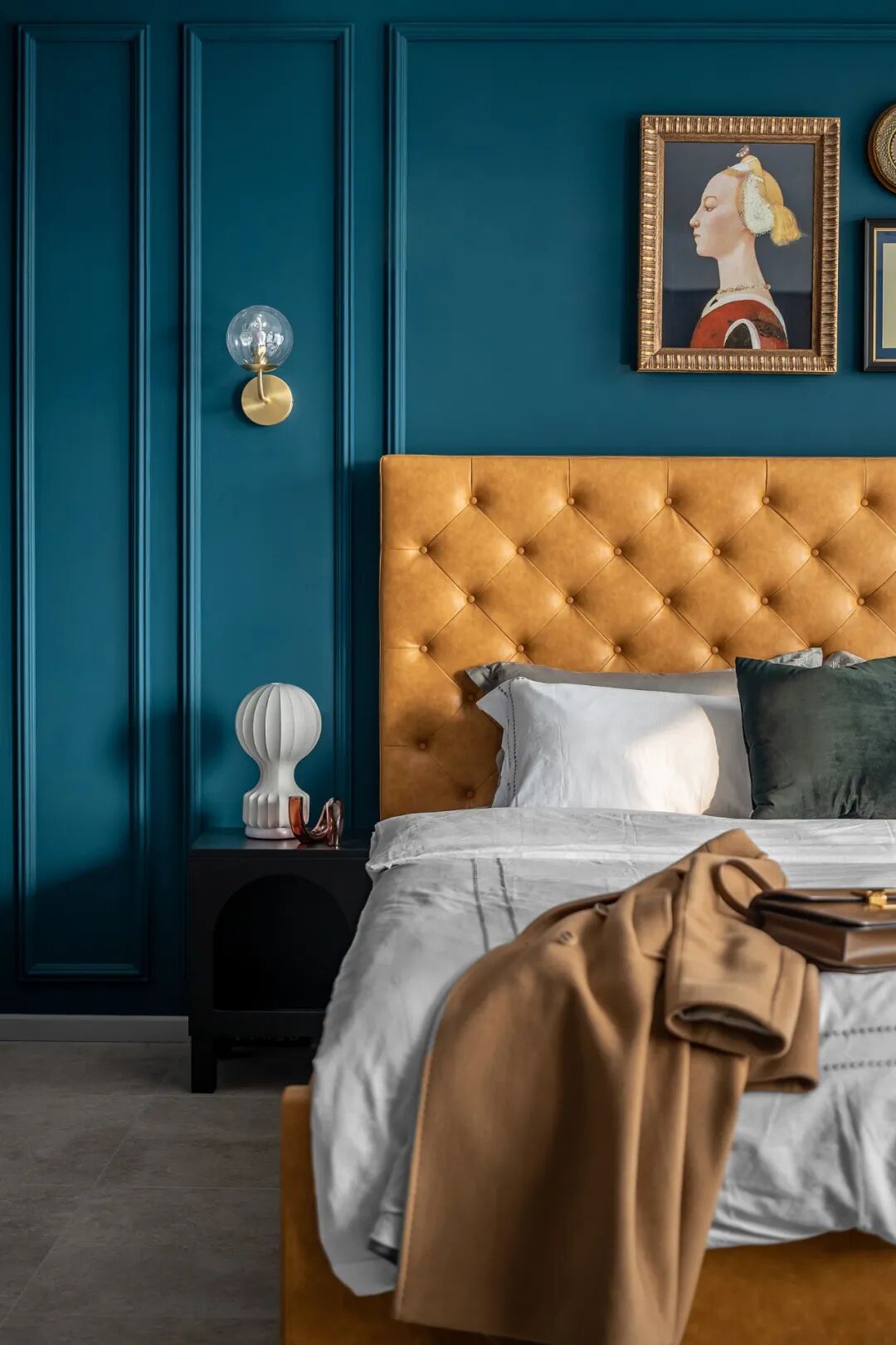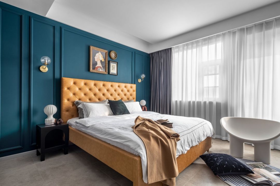 主卧室沿用客厅主调摩洛哥蓝同样加上石膏线条组合搭配太妃糖色高靠背床体、让空间富有节奏感同时不失复古高级感。