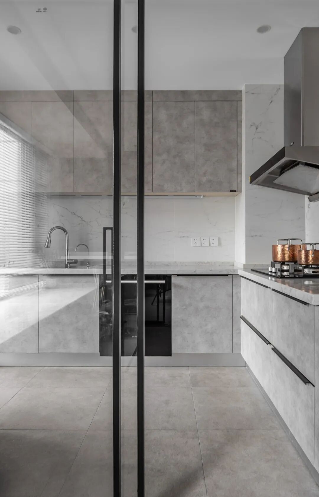 灰色岩板搭配大理石瓷砖,让一日三餐似乎也不那么枯燥无趣,倍感舒适放松。极窄边框玻璃门让空间更开阔通透。