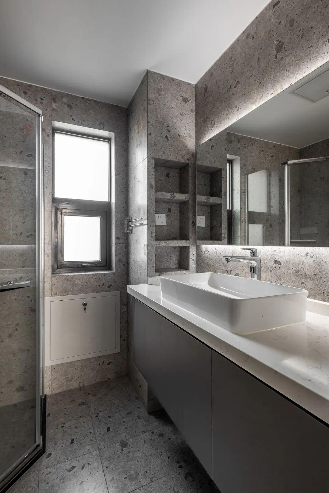 主卧卫生间区域为屋主打造出流畅的早起洗涮动线,水磨石瓷砖搭配深灰柜体,复古时尚。