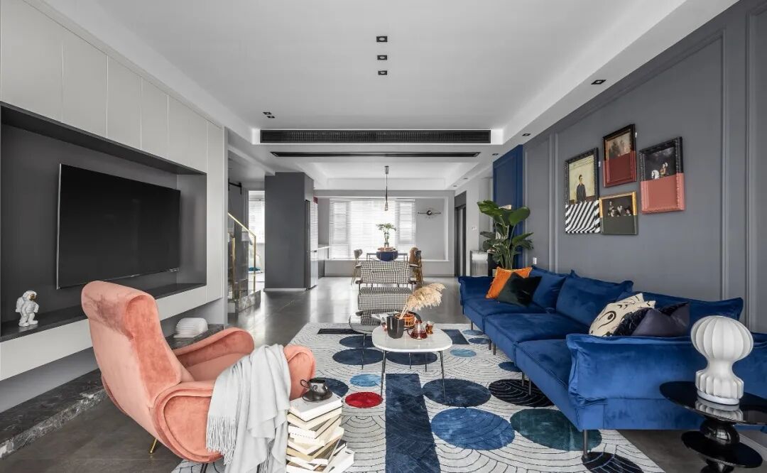 客厅主沙发的摩洛哥蓝色系是客户非常喜欢的色彩、为了色彩的延续和呼应。沙发背造型小尺度继续沿用了摩洛哥蓝、大面积以白鲸会来做底色,更好的凸显沙发的色质。