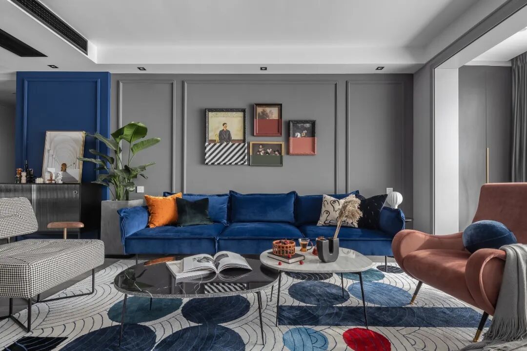 摩洛哥蓝与太妃糖撞色,通过不同材质的对比,巧妙地营造出了轻奢与舒适共存感。
