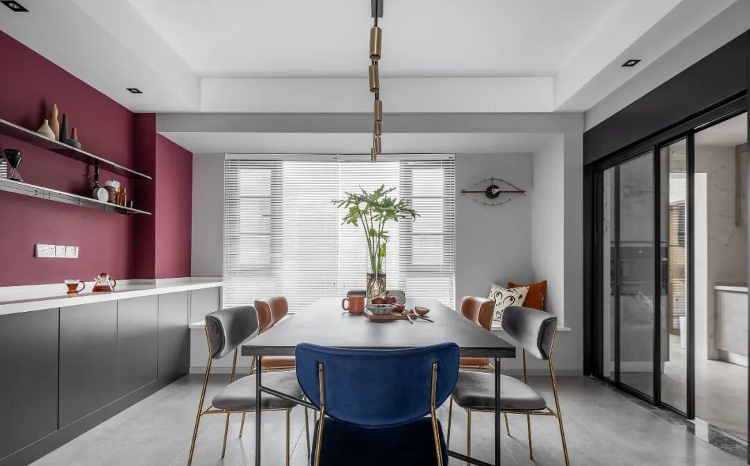 餐厅部分视野开阔、与客厅动线紧密联系、为了使两个空间色彩不要过于单调,西厨墙面选用了绛红色对比。