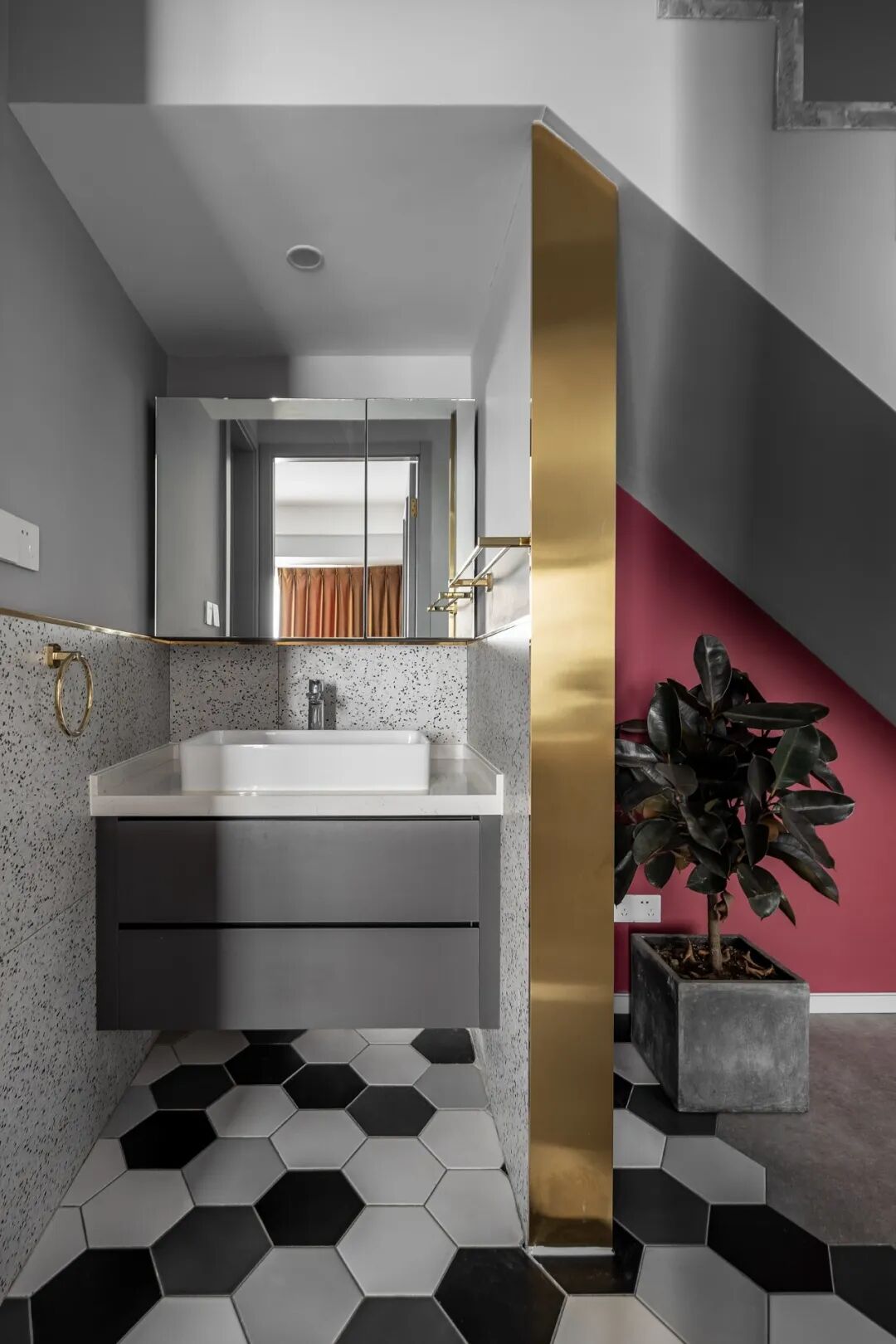 一楼卫生间进行干湿分区,巧妙的利用鸡肋空间隔出客用洗手台,金属元素搭配彩色墙