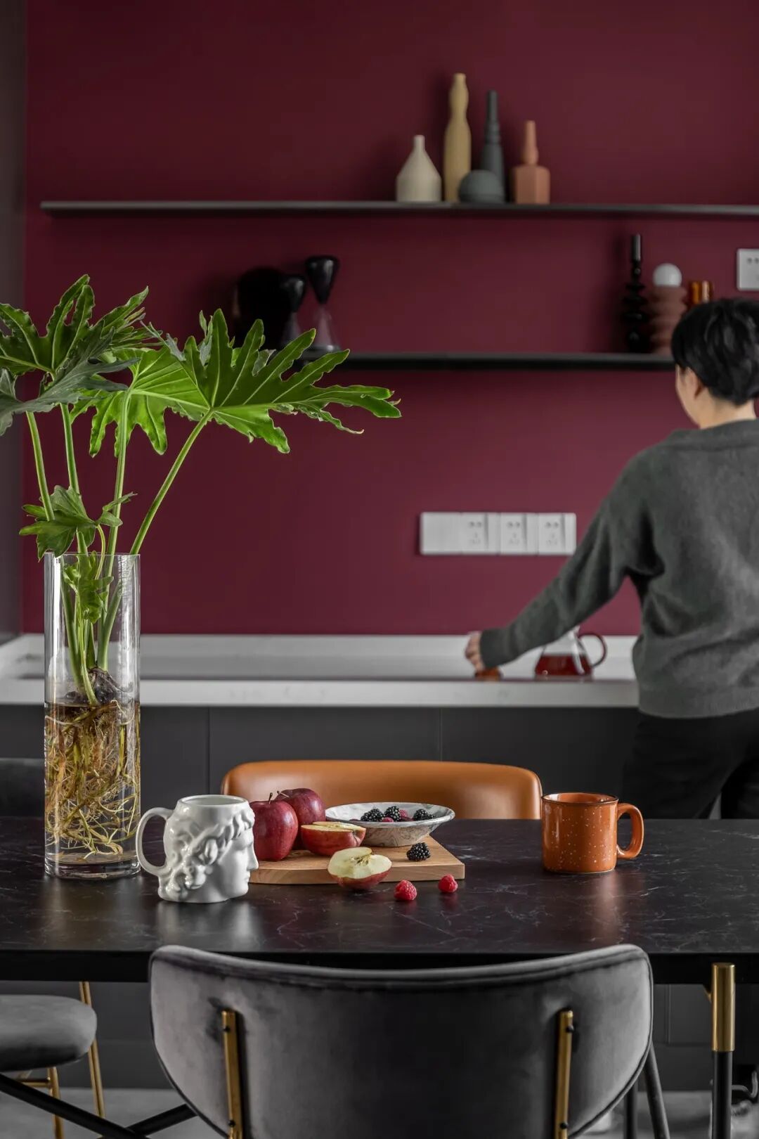 黑色墙面隔板放置着客户喜爱的器皿、实用富有变化,增添了空间趣味感。