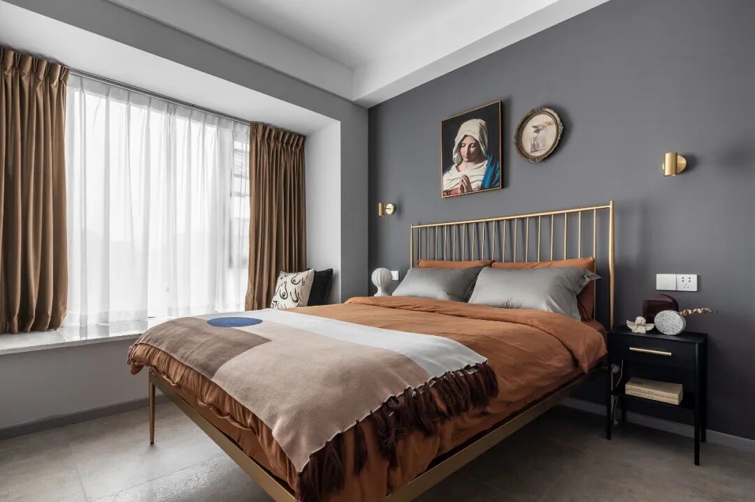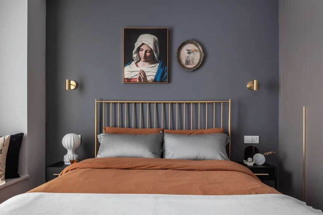 次卧由于加入了金属与复古挂画,让整个房间时髦起来,去繁就简,让本不太宽敞的空间瞬间舒展开来。