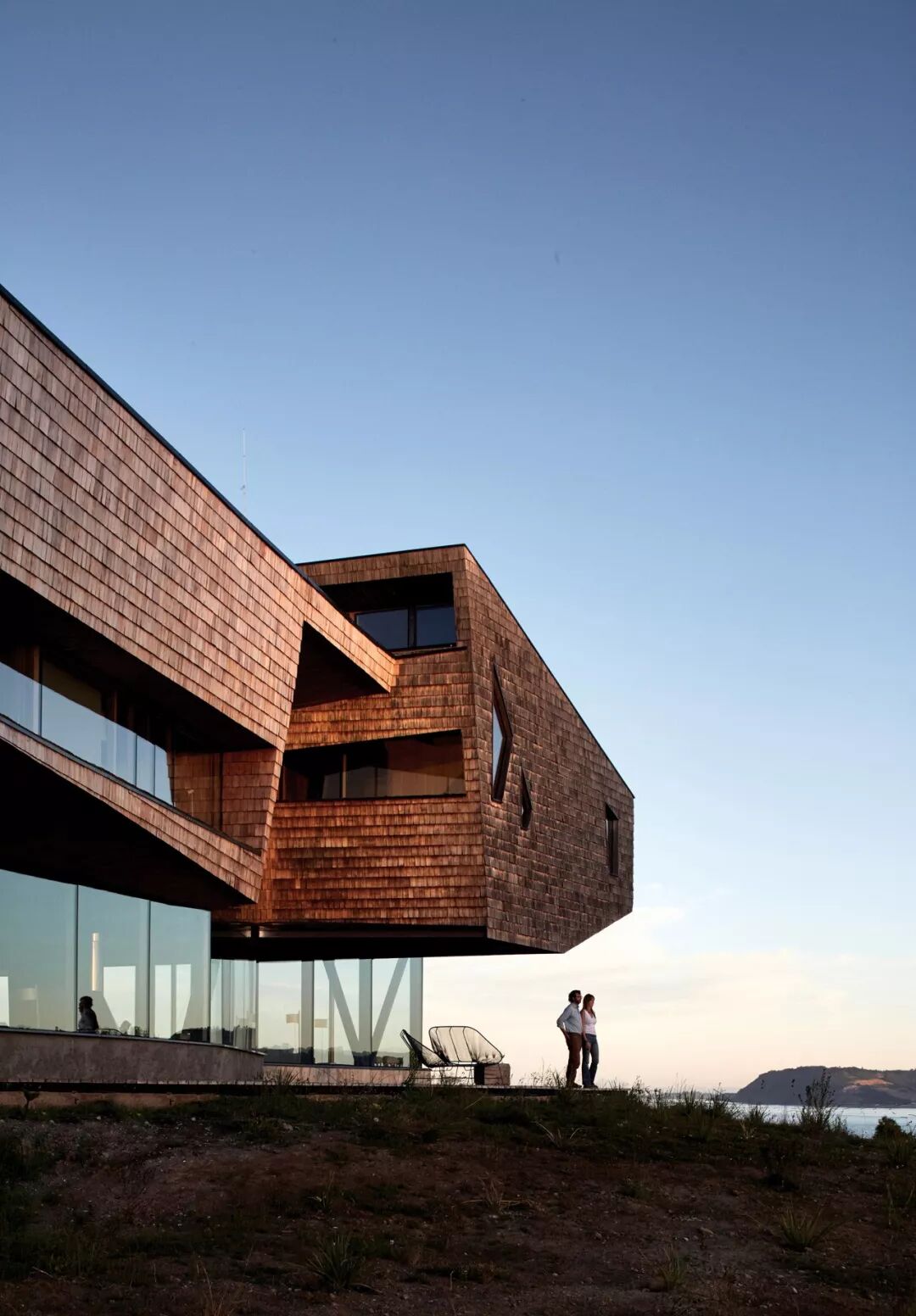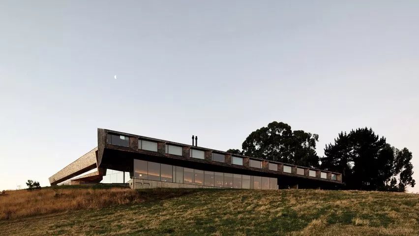 酒店位于智利Chiloe群岛的一个青草山上