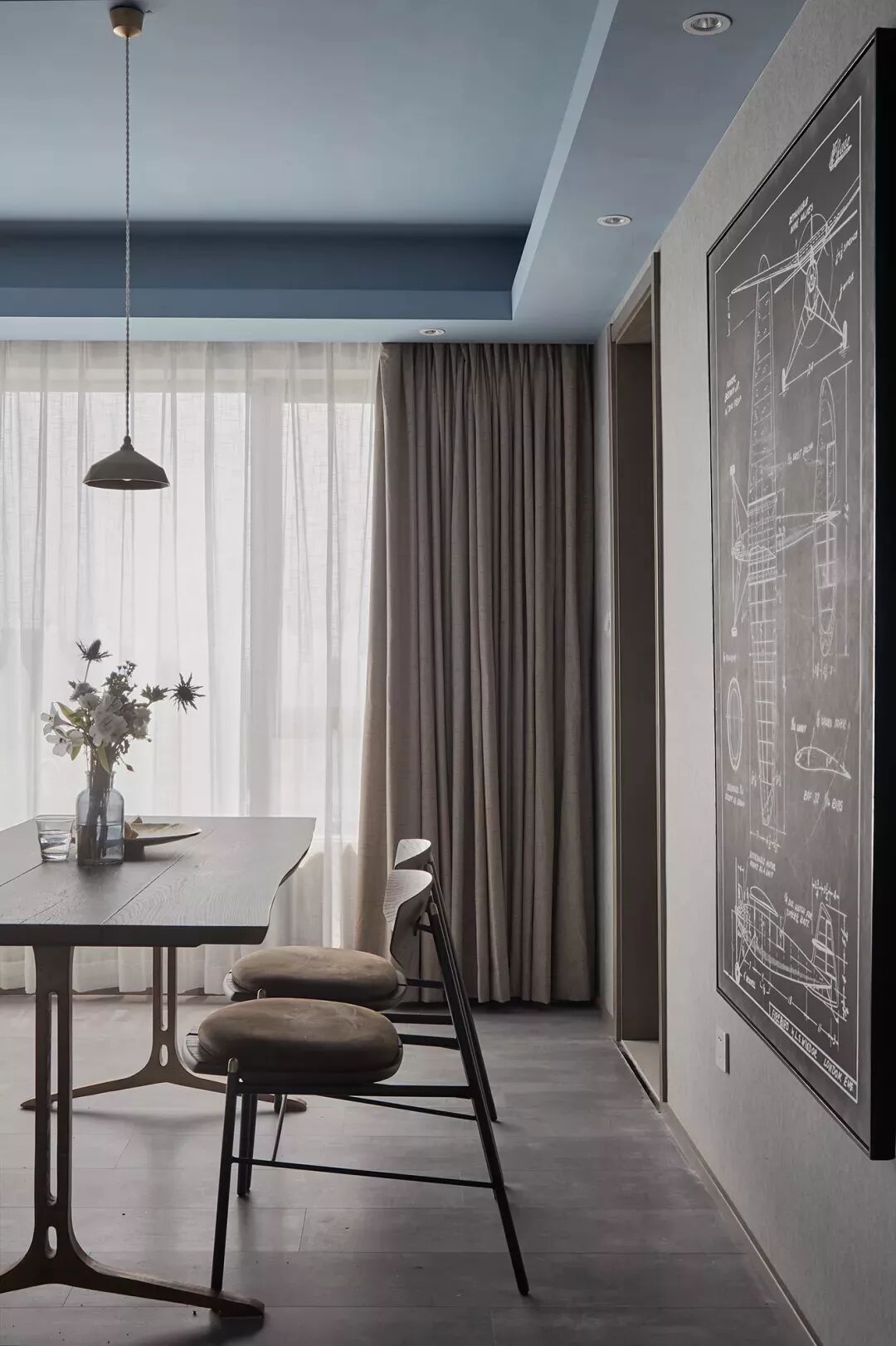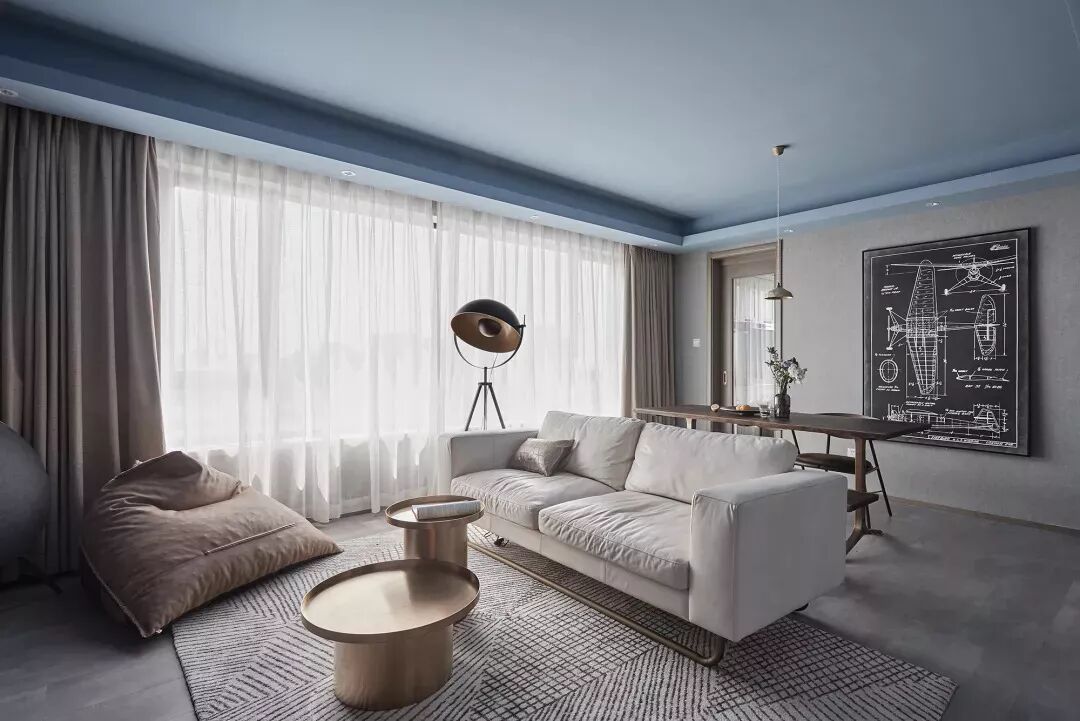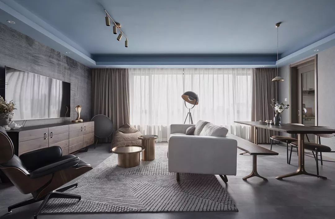 入户玄关走廊过后就是连在一起的客餐厅,餐桌椅摆放在沙发的背后,顶部蓝色的跌级吊顶和灰色的墙地面,营造出一个格调感满满的空间。