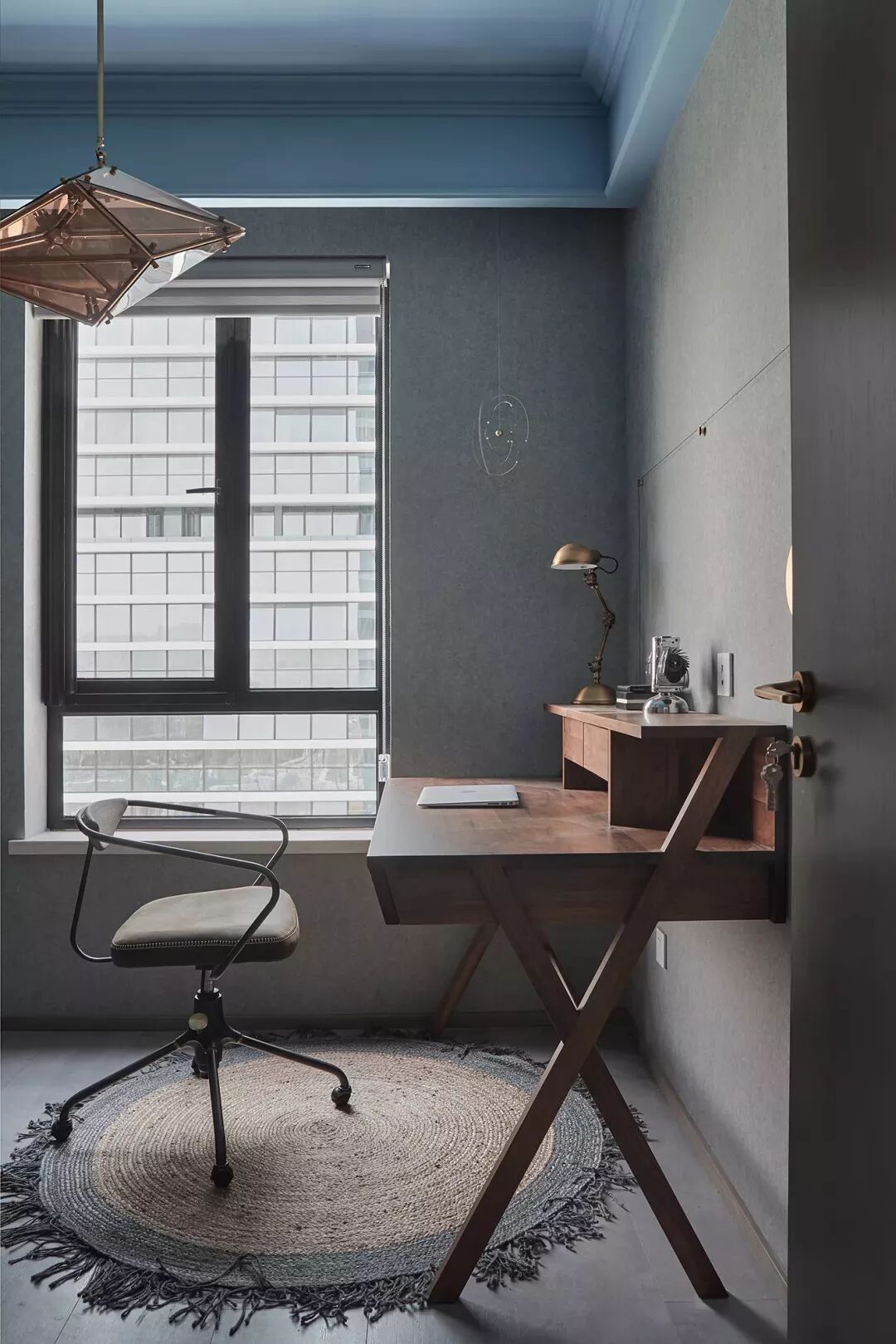 书房结合了两间卧室的设计,以灰色壁纸和蓝色天花营造安静的氛围,书桌配有收纳台面营造更整洁的办公环境,特别的舒心自在。