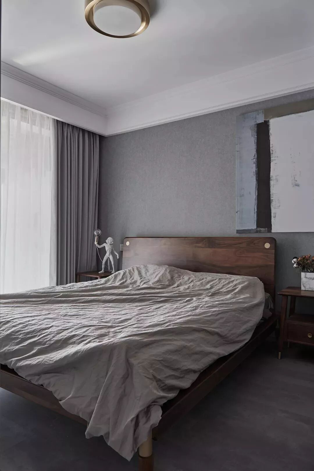 次卧的天花板刷成了白色,墙面和走廊一样,也是铺贴了灰色的壁纸,再加上实木的床、床头柜,整体给人一种干净利落的感觉。