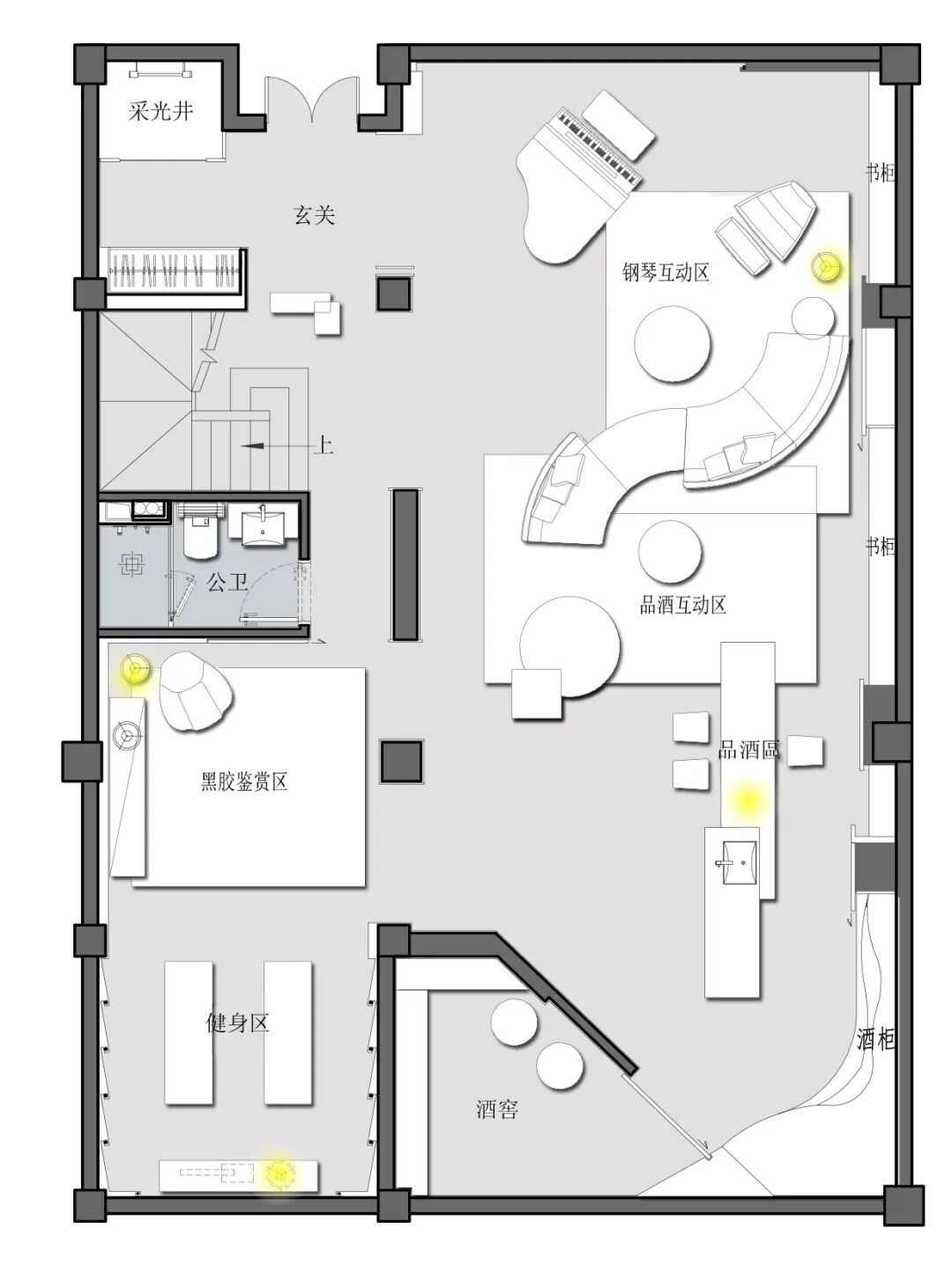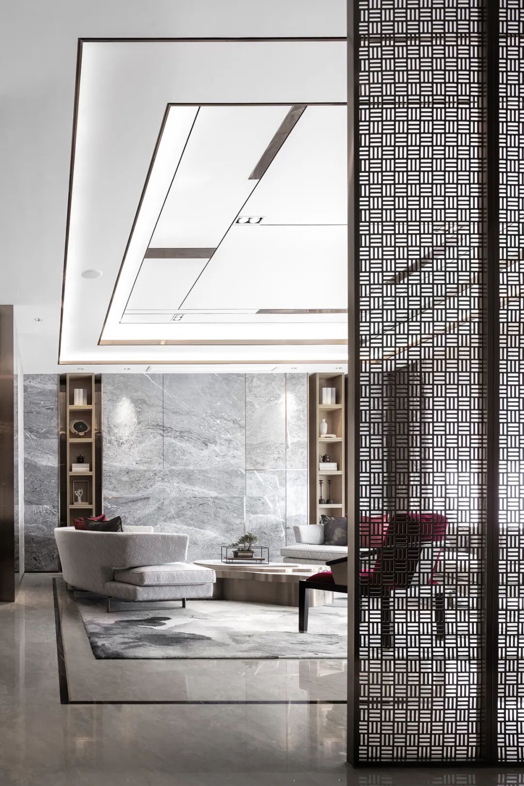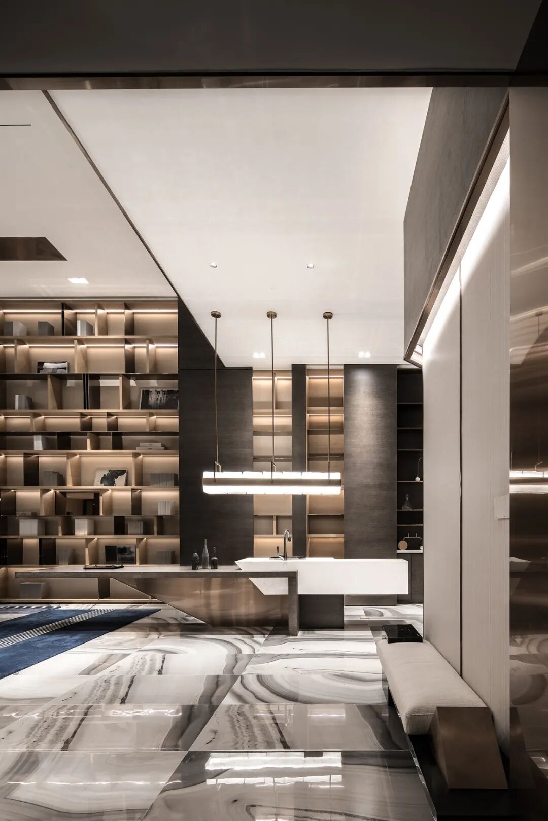 人性化设计给空间带来更多灵活性和交互感,水吧台与桌子的几何拼贴脱胎于“新造型主义”,S形对角沙发却融入了古典浪漫与极致优雅。