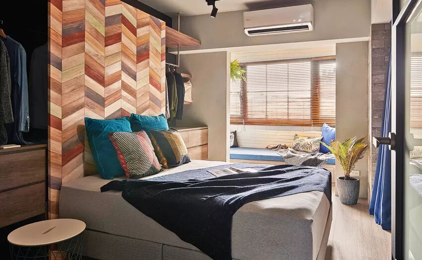 卧室是屋主日常生活中最常待的空间,一开始规划时便提出希望有个活泼主题妆点卧室,考虑了木作、油漆等方式,最后决定以仿真度高的进口壁纸装饰活动式床头板,和纯木作相比更轻巧,另一方面也可作为床后衣柜的门板使用,将换季寝具藏在门后空间。从客厅透过玻璃隔间即可一眼望见,人字拼的亮眼图案装饰性十足。原本与卧室相连的阳台打掉隔间后设计成室内卧榻,留下一部分原始墙作为区域划分,用水泥粉光带出朴实质感。