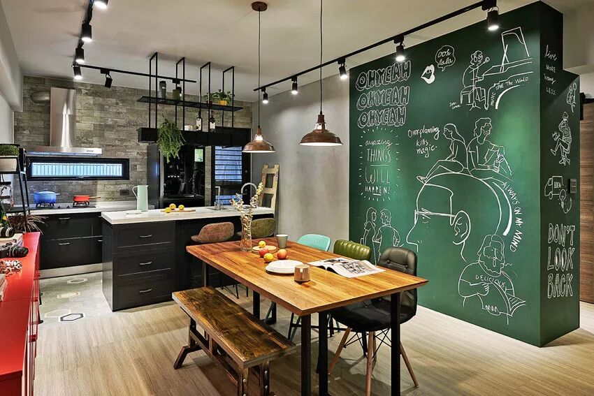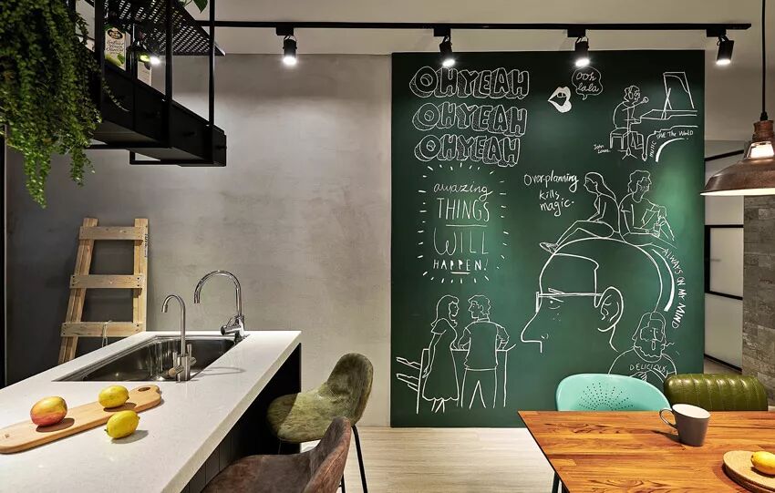 为了保证室内采光,设计师拆除原始厨房隔间,改为开放式厨房。屋主平常下厨时间不多,厨房硬体以简单为主,白色人造石台面搭配深铁灰色橱柜规划中岛,加上铁件吊架,完成简约而现代的中岛吧台。惹眼黑板墙则是设计师增加活泼感的巧思,选用彩度较高的绿色黑板漆,饱和的绿与一旁浅灰水泥粉光墙形成完美映衬。而因开放式的家中没有做太多储藏空间,黑板墙后方正好设置半开放的收纳柜,妥善运用了动线上的零碎空间。