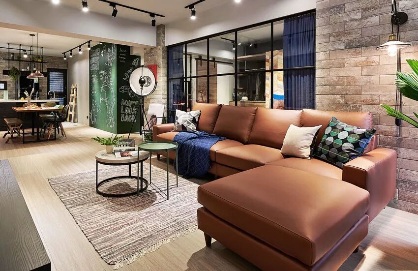 以黑框玻璃隔间区隔主卧室和客厅,保留空间通透感,让卧室吸睛的床头板将活泼气氛延伸至客厅。全室使用大量木质、红砖等偏暖色的大地色系建材,选用浅色超耐磨木地板,加上水泥粉光、黑板墙等不同墙面质感,构筑有层次的视觉,并在层架、照明等加入黑色铁件增添硬派况味。