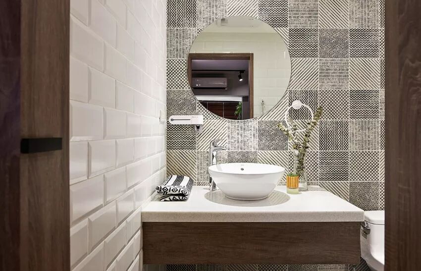 卫浴墙面选择带有手绘风格的西班牙进口花砖搭配白色麵包砖,黑白几何线条感觉整齐中带点律动感,饶富趣味。洗手台以木作规划不落地的设计,方便打扫清洁。